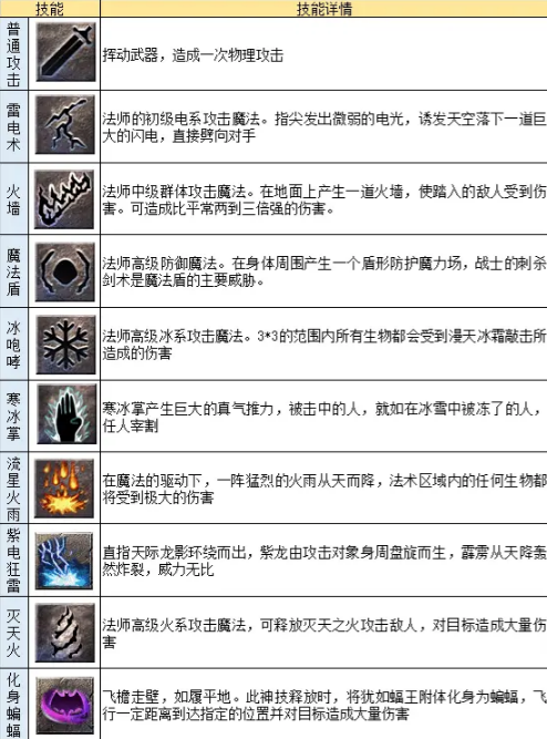 法师英雄技能一览法师职业需要玩家具备良好的操作技巧和战斗意识。通过合理的技能选择和精妙的操作,法师可以在战斗中发挥巨大的作用。当然,也需要注意自己“脆皮”的弱点,尽量让战士同伴在一旁掩护。法师沿用端游火墙、流星火雨、紫电狂雷等特色技能,相对其他职业,更注重“操控”与“高输出”。法师英雄的羁绊技能亦然,法师职业+任一法师英雄即可获得法法特技——三倍伤害,瞬间带来的巨额输出,秒杀敌人不在话下。而法师职业+战士道士英雄的搭配特技——无限控制,更有概率击晕敌人,配合其他控制技能,是非常可怕的存在。