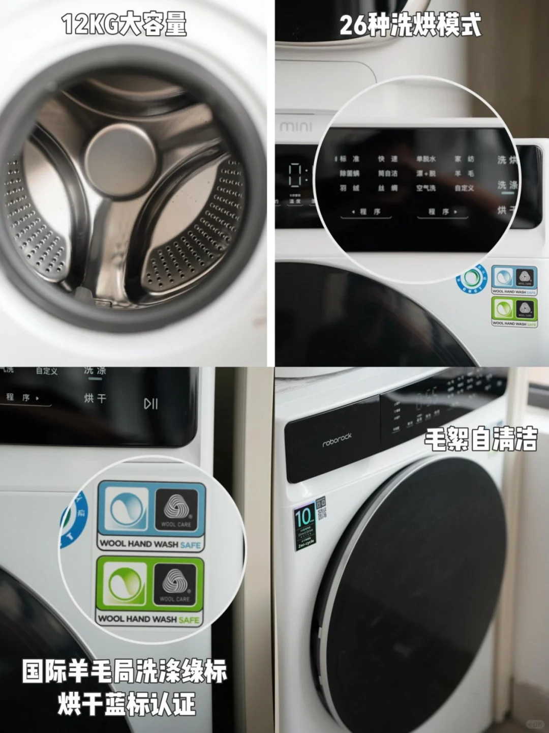 家里用的这台石头分子筛洗烘一体机H1 Air还是很好用的采用了分子筛黑科技,先吸水后烘干,大大提升了烘干效率,就连四件套都可以快速烘干,干到可以直接用,使用过程当中不会有缩水的问题,它可是获得了国际羊毛局的洗涤绿标和烘干蓝标的双认证,羊毛真丝类娇贵的面料衣物都可以在家洗,而且它可以把衣物表层的毛絮什么的都给清理掉,甚至还可以自动清洁毛絮收集盒,特别省心,而且它还搭载了空气洗功能,吃火锅/穿过一两次的外套塞进去,用空气洗就可以把异味洗掉了,有12 kg 的大容量,1家几口的衣服都能够塞进去,清洁又能够高效除菌防螨,能力很强��!除了实用的烘干功能之外。洗衣功能也很强大,有1.1的洗净比,还有特渍洗功能,各种各样的污渍都可以洗的干干净净的,特别省心!