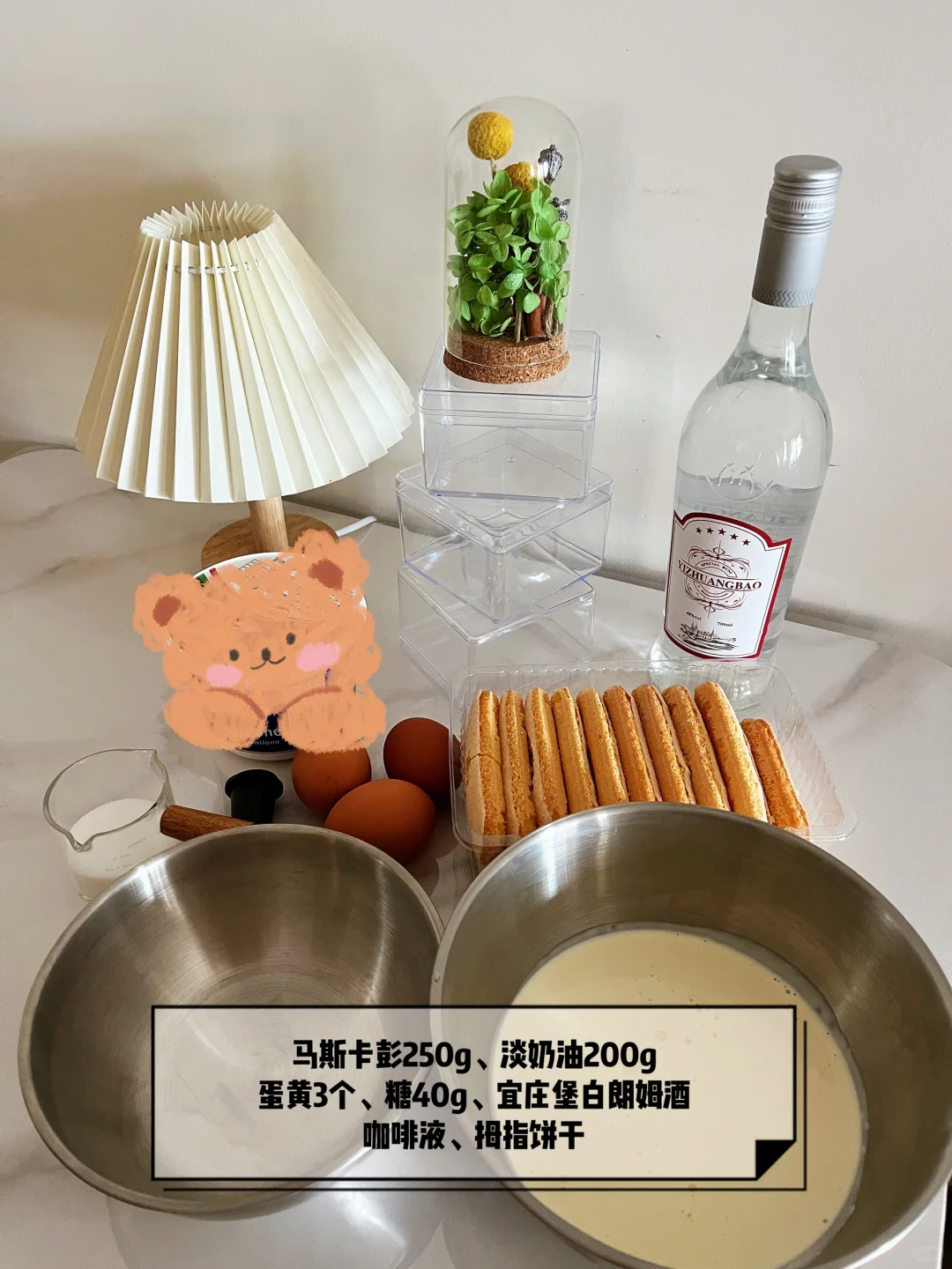 马斯卡彭250g 淡奶油200g 白砂糖40g 蛋黄3个 咖啡液 拇指饼干 宜庄堡白朗姆酒