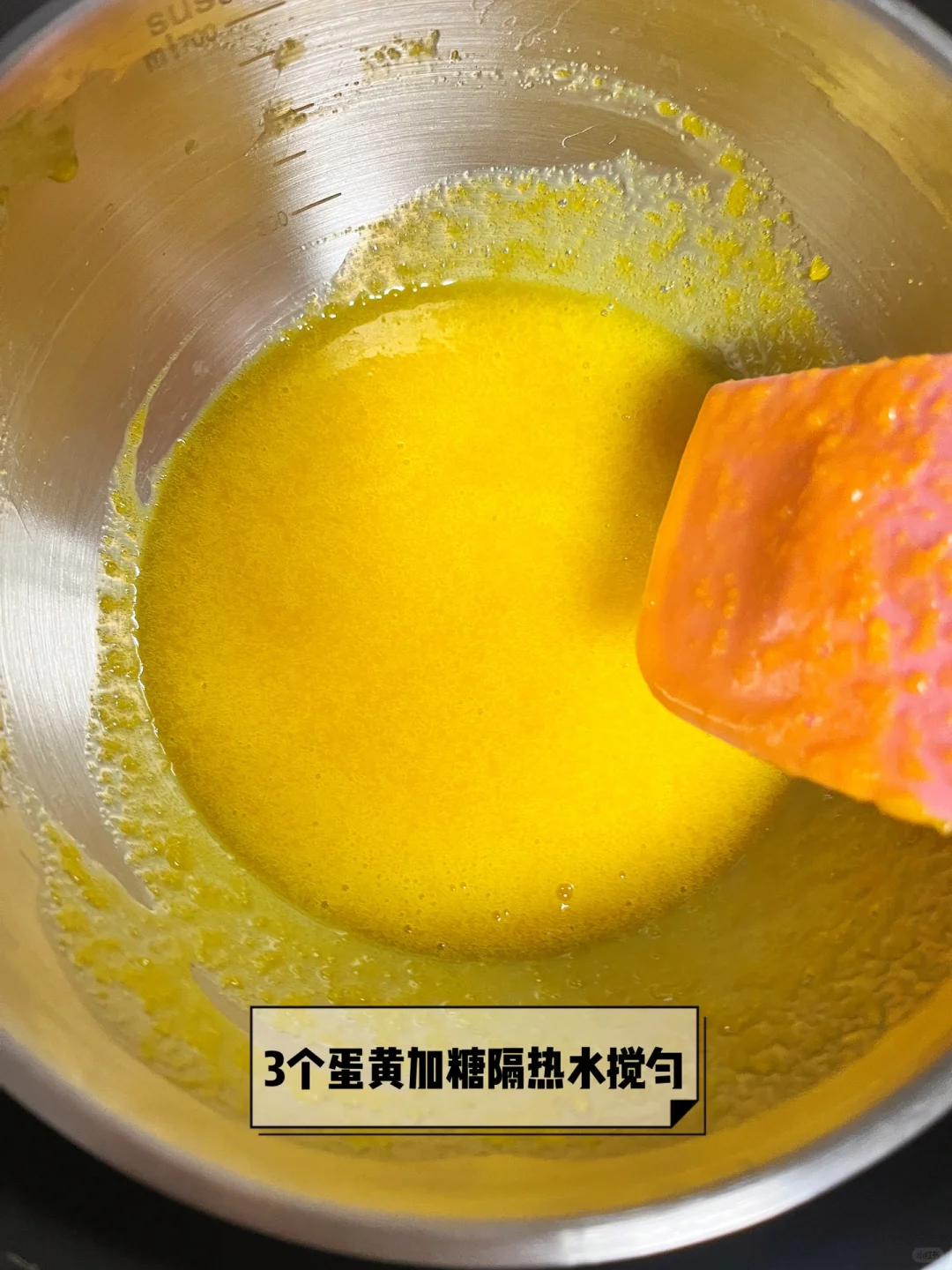 ①蛋黄液加入糖隔着热水搅拌融化均匀