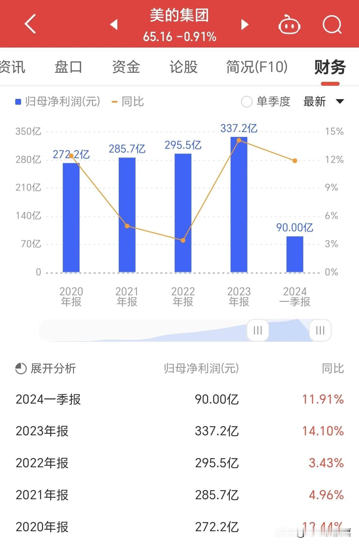 在家电行业,美的集团算是元老级别的企业了,这几年业绩也是蒸蒸日上,2020年其营收2857亿,到了2023年增长至3737亿,2024年一季度为1065亿,同比增长10.19%。2020年其净利润为272.2亿,到了2023年增长至337.2亿,2024年一季度为90亿,同比增长11.19%。你觉得美的集团2024年业绩会继续创新高吗?