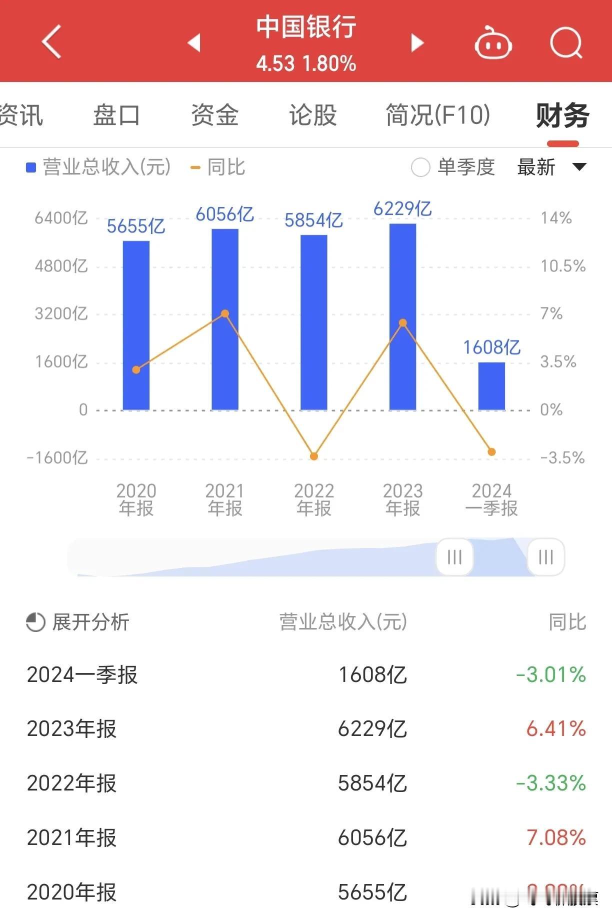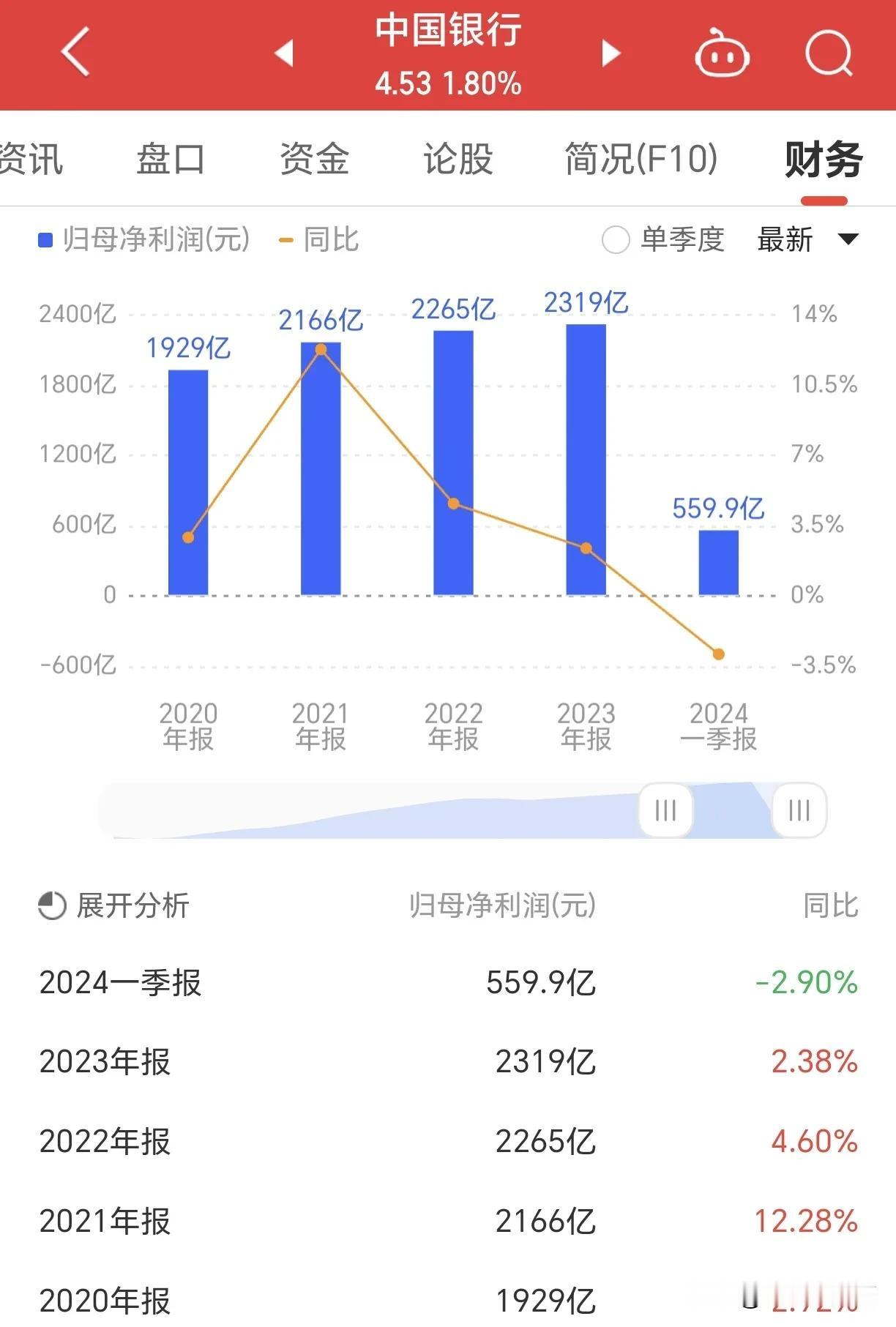 银行是国家经济支柱产业,在投融资中起到关键支撑作用,近两年银行股长势凶猛,以中国银行为例,2022年其股价低至2.57元,到了2024年最高涨至4.78元,但是业绩其实已经处于拐点了,2024年一季度营收为1608亿,同比下滑3.01%,实现净利润559.9亿,同比下滑2.9%。