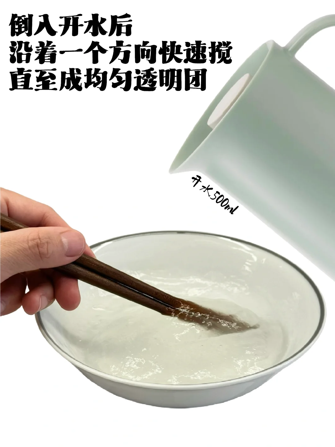 味道酸酸辣辣 口感柔软又有弹性 夏季开胃爽口NO.1[赞R] 👉Tips 调味🉑根据个人口味调整 不喜吃酸🉑减少醋的量 喜辣🉑多加辣椒油 稍稍放凉或冲下冷水后口感🉑更Q 👉技术总结 淀粉和冷水搅拌均匀后🉐尽快倒入开水 否则淀粉和水会分层 开水倒下去后🉐马上用筷子搅 搅的速度🉐快 🉐搅成一整个均匀的透明的团团 且筷子搅动的时候带有明显的阻力感