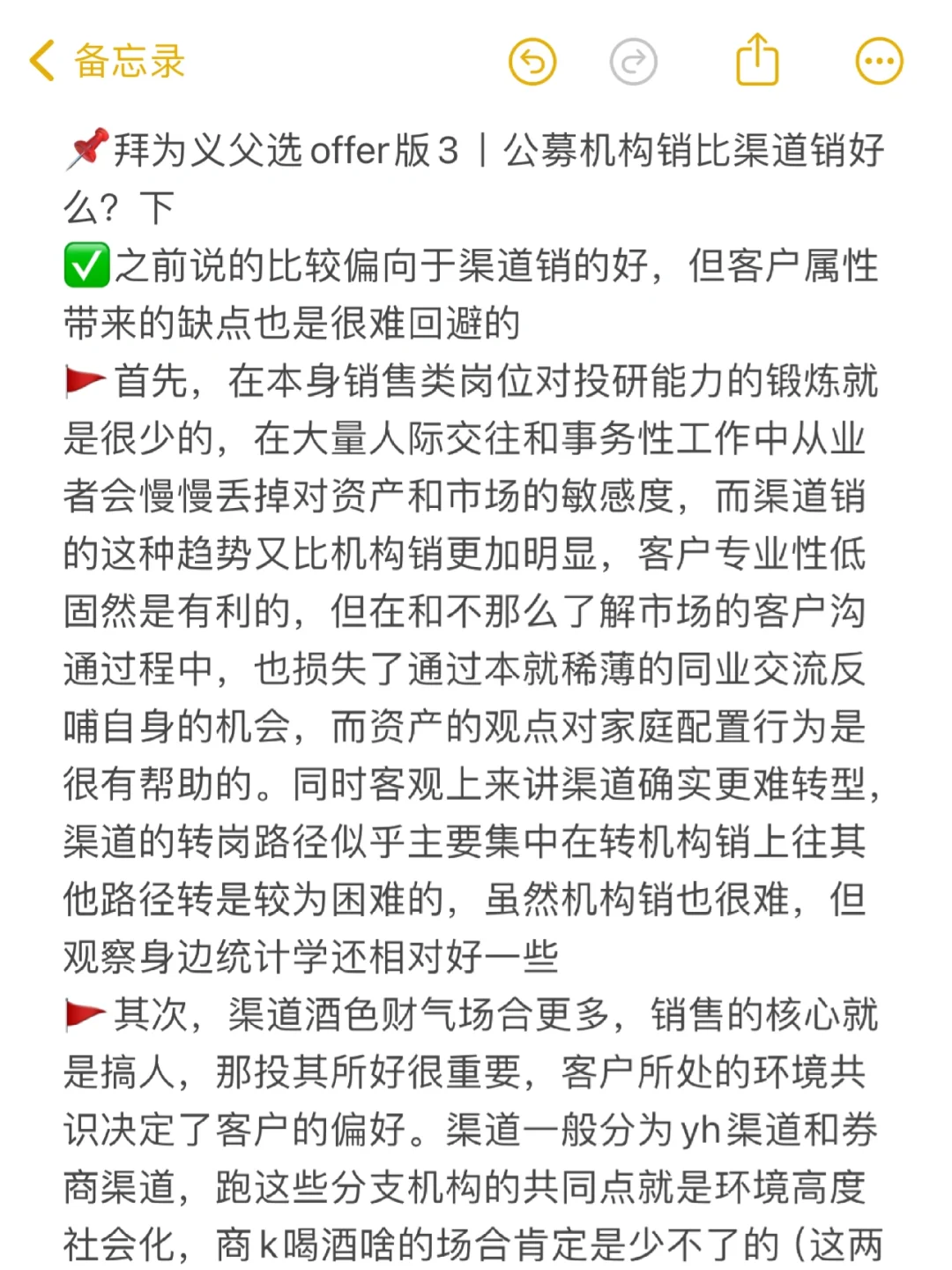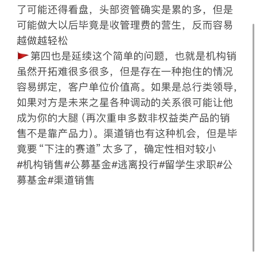 🚩第四也是延续这个简单的问题,也就是机构销虽然开拓难很多很多,但是存在一种抱住的情况容易绑定,客户单位价值高。如果是总行类领导,如果对方是未来之星各种调动的关系很可能让他成为你的大腿(再次重申多数非权益类产品的销售不是靠产品力)。渠道销也有这种机会,但是毕竟要“下注的赛道”太多了,确定性相对较小