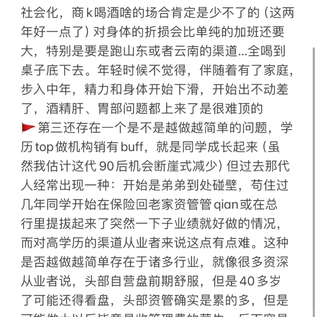 🚩第三还存在一个是不是越做越简单的问题,学历top做机构销有buff,就是同学成长起来(虽然我估计这代90后机会断崖式减少)但过去那代人经常出现一种:开始是弟弟到处碰壁,苟住过几年同学开始在保险回老家资管管qian或在总行里提拔起来了突然一下子业绩就好做的情况,而对高学历的渠道从业者来说这点有点难。这种是否越做越简单存在于诸多行业,就像很多资深从业者说,头部自营盘前期舒服,但是40多岁了可能还得看盘,头部资管确实是累的多,但是可能做大以后毕竟是收管理费的营生,反而容易越做越轻松