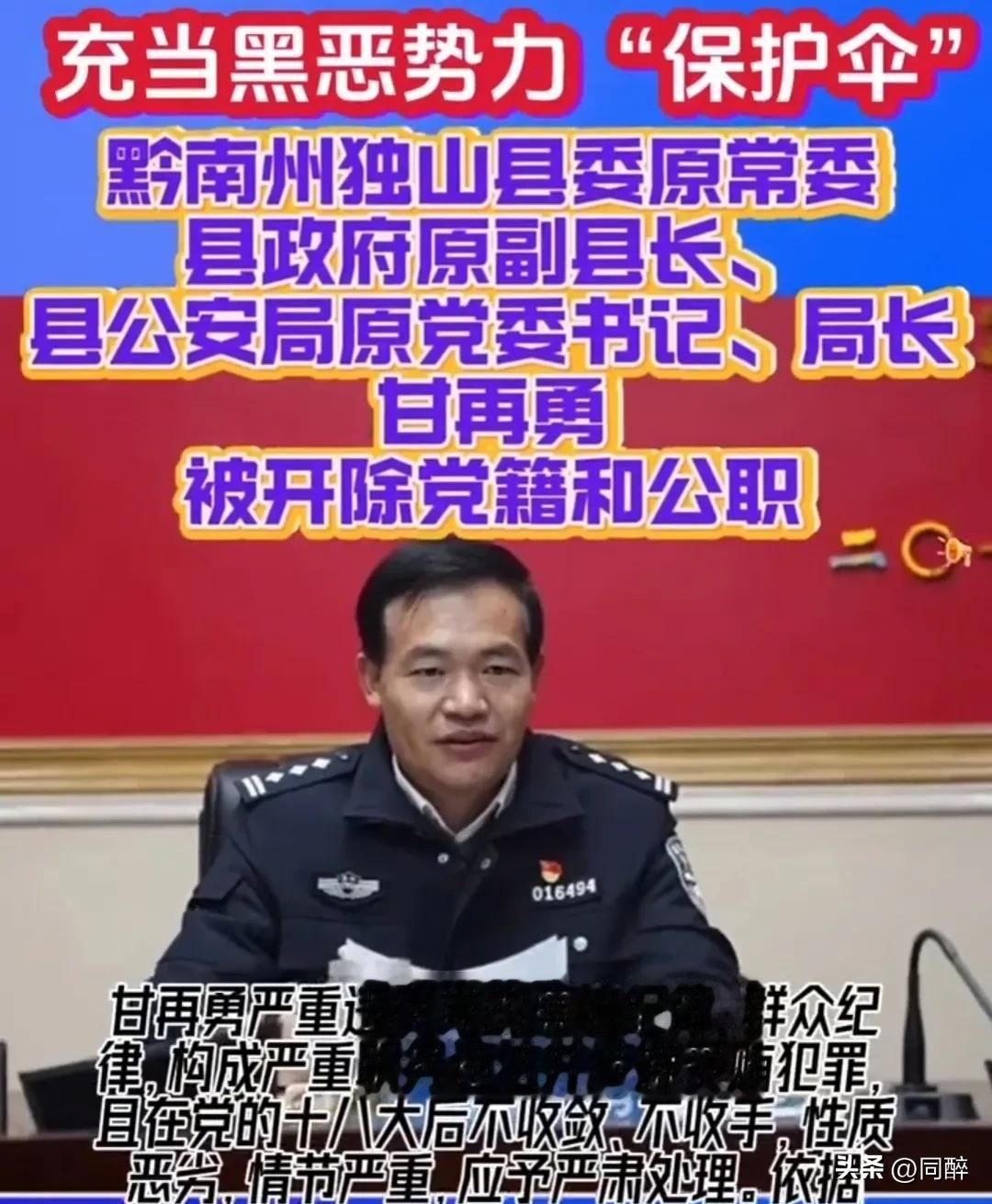 2024年12月,贵州省纪委监委的一则通报宣告了甘再勇看似辉煌的职业生涯的彻底结束:黔南州独山县委常委、副县长、县公安局局长、三级高级警长甘再勇涉嫌严重违纪违法,接受黔南州纪委监委纪律审查和监察调查。