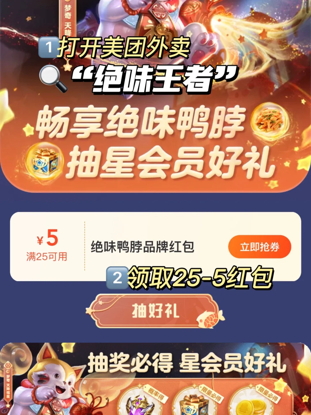 谁说买绝味鸭脖容易破产!? 这不王者荣耀也来送福利了 美团外卖🔍绝味王者 立享25-5的美团红包🧧 点了爱吃的鸭脖、锁骨、鸭翅! 这下可以边打游戏边吃了 不要太开心啊!! 吃完 还能参与抽奖还能获得游戏皮肤~ 还有机会抽到各种限定皮肤和苹果🍎手机! 这波直接冲!!