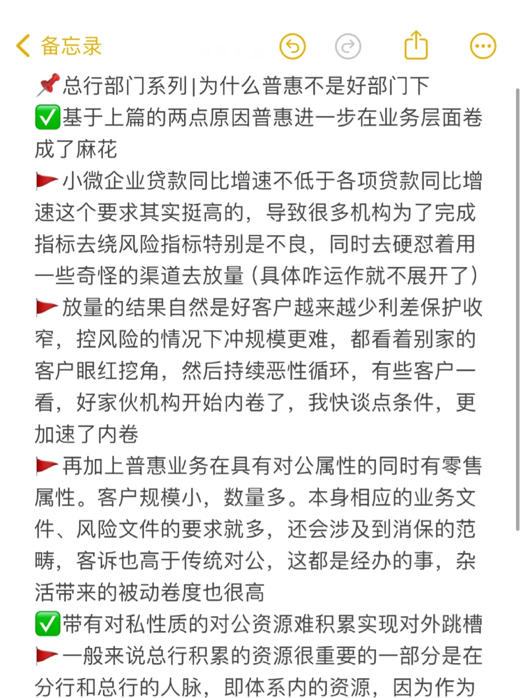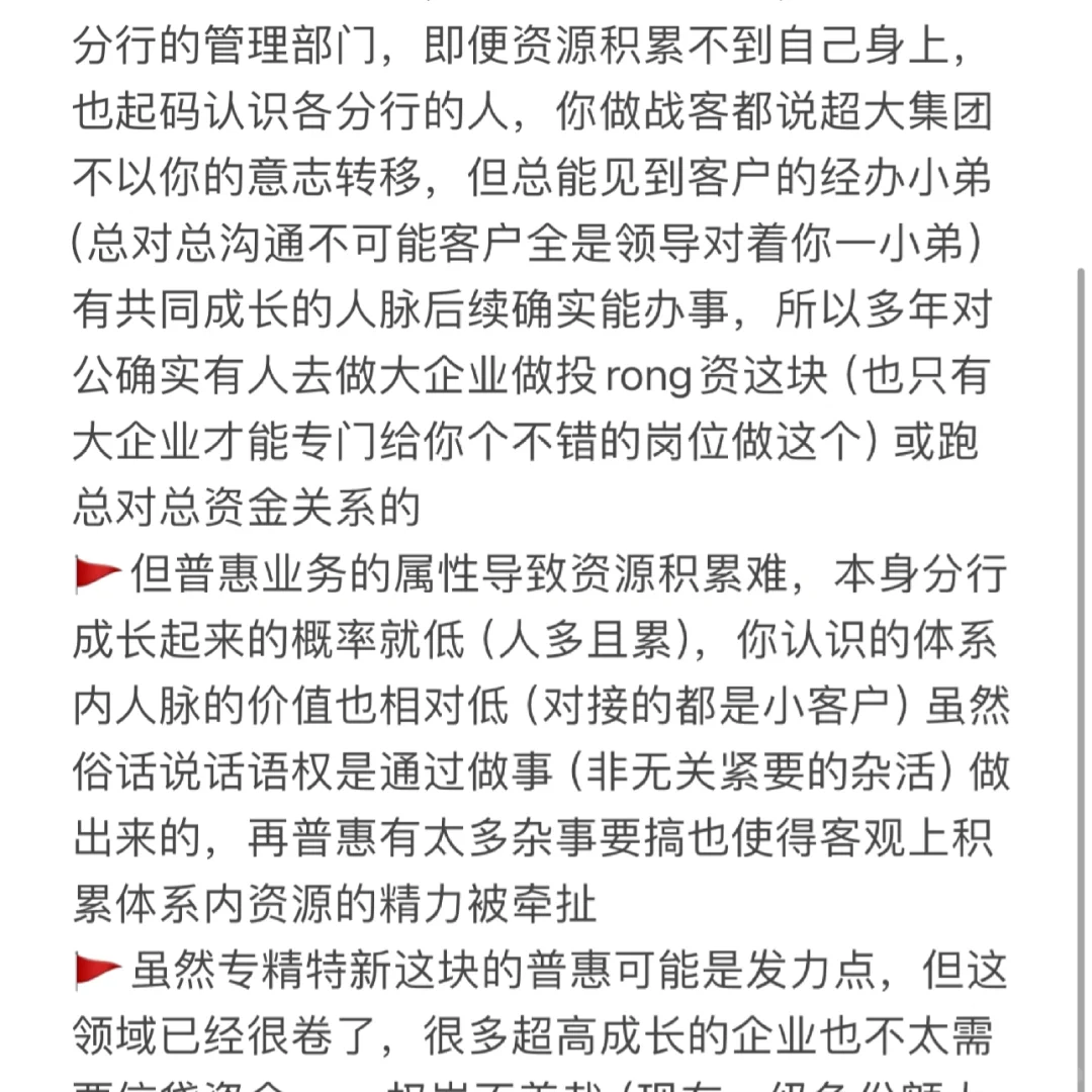 🚩但普惠业务的属性导致资源积累难,本身分行成长起来的概率就低(人多且累),你认识的体系内人脉的价值也相对低(对接的都是小客户)虽然俗话说话语权是通过做事(非无关紧要的杂活)做出来的,再普惠有太多杂事要搞也使得客观上积累体系内资源的精力被牵扯