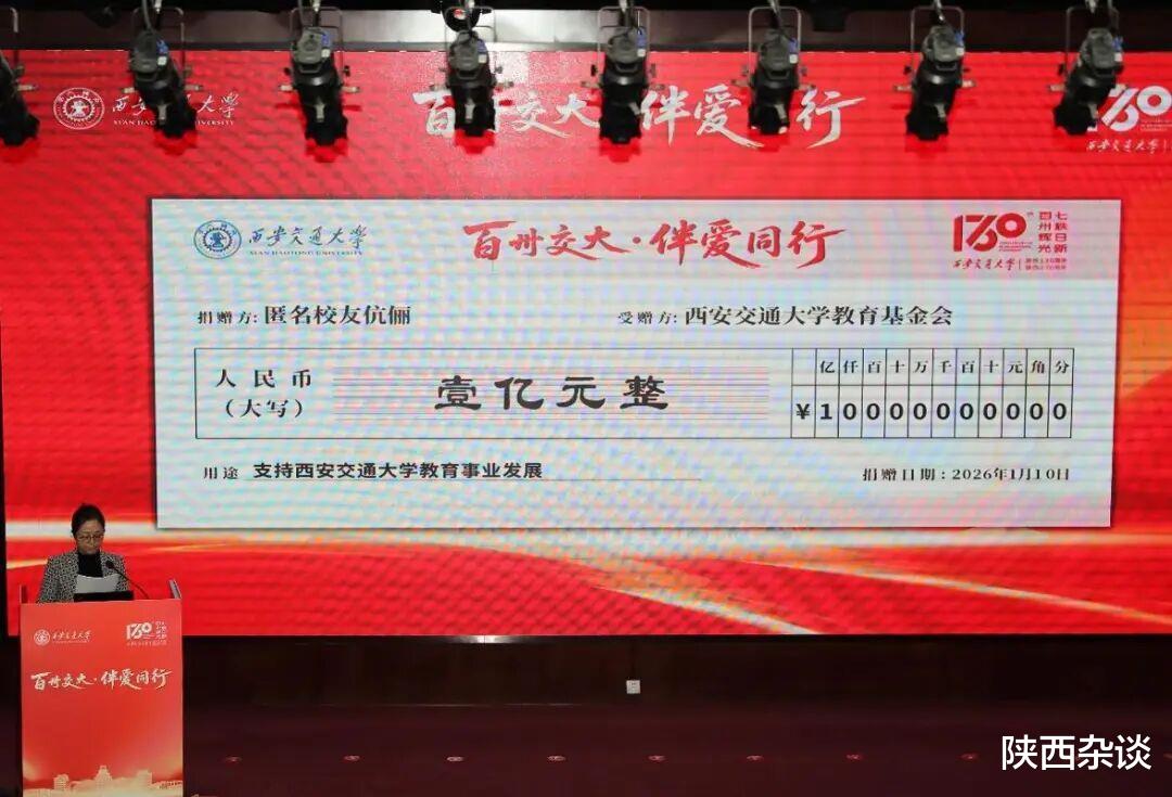 1月10日,西安交通大学“百卅交大·伴爱同行”捐赠仪式在兴庆校区举行。一对校友伉俪匿名向母校捐赠1亿元。