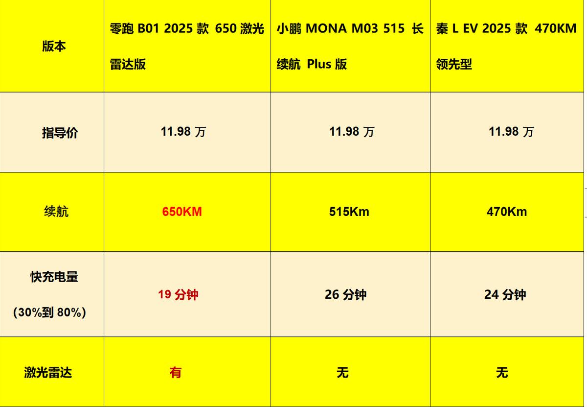 在新能源汽车领域,续航始终是消费者很看重的点,电池容量大就是相当于油车的油箱大,续航里程更远,小鹏MONA M03和秦L EV的起步价格都是11.98万,咱们就拿它们的入门版车型来说,小鹏MONA M03的纯电续航为515km,秦L EV的续航里程为470km,而零跑B01的同价位车型是2025款 650激光雷达版,这款车则是顶配,续航里程达到了650km,而且,这款车在当下的优惠幅度也很大,裸车价补贴能有6000元甚至更高,实际售价在11.38万左右(具体以经销商报价为准),价格优势非常明显。而且值得一提的是,指导价9.58万的550舒享版,550km续航,高速爆胎稳定、快充等等都有,优惠后加上保险上牌等费用,落地价10万不到,真的是10万内能买到的更好的选择了!