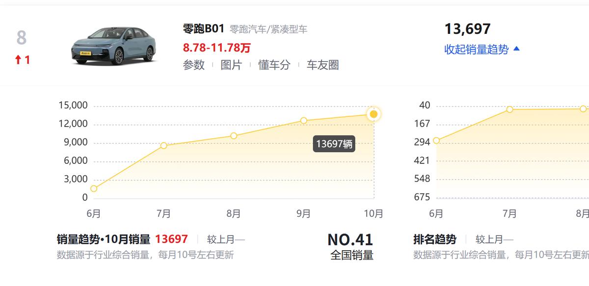 10月份,不到10万的家用轿车中,零跑B01可是足足卖出了13697辆,除此之外,星愿、海鸥、海豚、缤果S这些车也销量过万了,但是都是小型车或者两厢车,城市代步还可以,但是偶尔跑跑长途就歇菜了。小鹏MONA 03的月销量虽然达到了16309辆,但是,这款车起步价就要11.98万,而零跑B01,550续航、8155智舱,现在不到10万就能拿下,提车效率据说也挺快,而且还有包括三电、整车的终身质保。