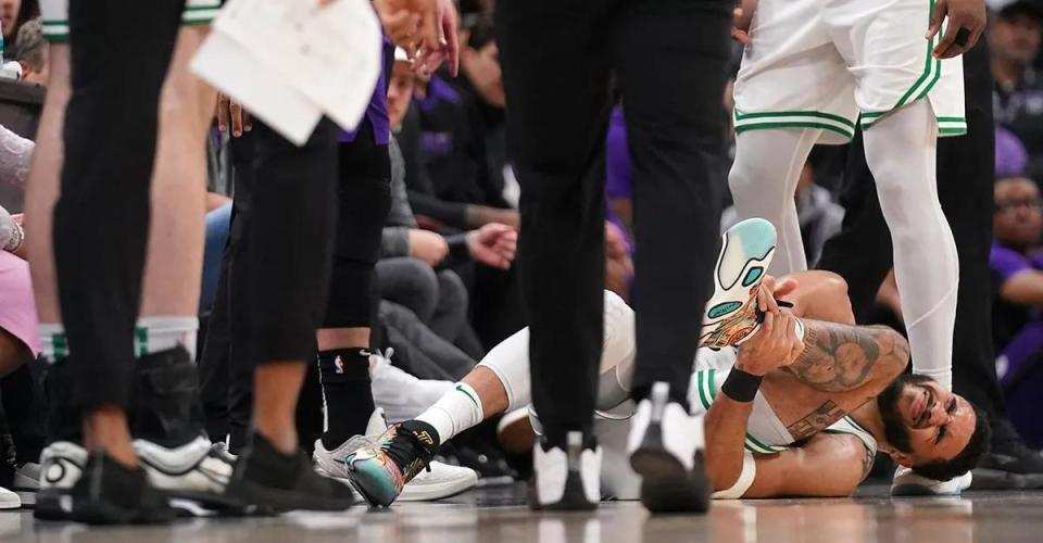 本周对阵国王队的比赛中,塔图姆投三分时被小萨博尼斯垫脚,慢镜头显示其左脚呈夸张90度扭曲。医疗专家此前预估这种伤势至少需要一周恢复,但这位27岁球星不仅完成当场罚球,更在缺席对阵太阳一战后迅速回归赛场,连主帅史蒂文斯坦言"起初令人捏把汗"。