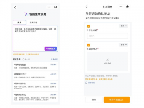 例如“快放寒假了,帮我创建一条给家长们看的放假通知接龙,我需要各位家长看完后在线签名”“寒假我想给班里学生布置21天的课外阅读打卡,需要学生提交阅读课外书的视频,还要有读书笔记”。