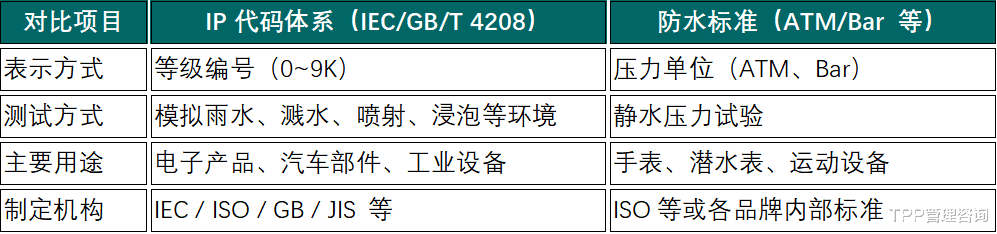 (5)中国的防水标准体系在国内,防水等级同样有相应的国家标准体系,与国际标准高度接轨。主要包括:GB/T 4208《外壳防护等级(IP代码)》