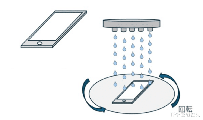 和IPX3相似,但更猛烈。这次水从各个方向泼过来,流量同样是每分钟10升,但覆盖范围更广。它模拟的是被四面八方的雨水包围的情形。