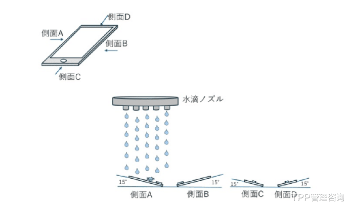 比IPX1更进一步。设备被倾斜成15°角,让水从不同方向滴下——四个角度各2.5分钟,总共10分钟。就像测试设备被放在斜坡上时,能否防住雨滴一样。