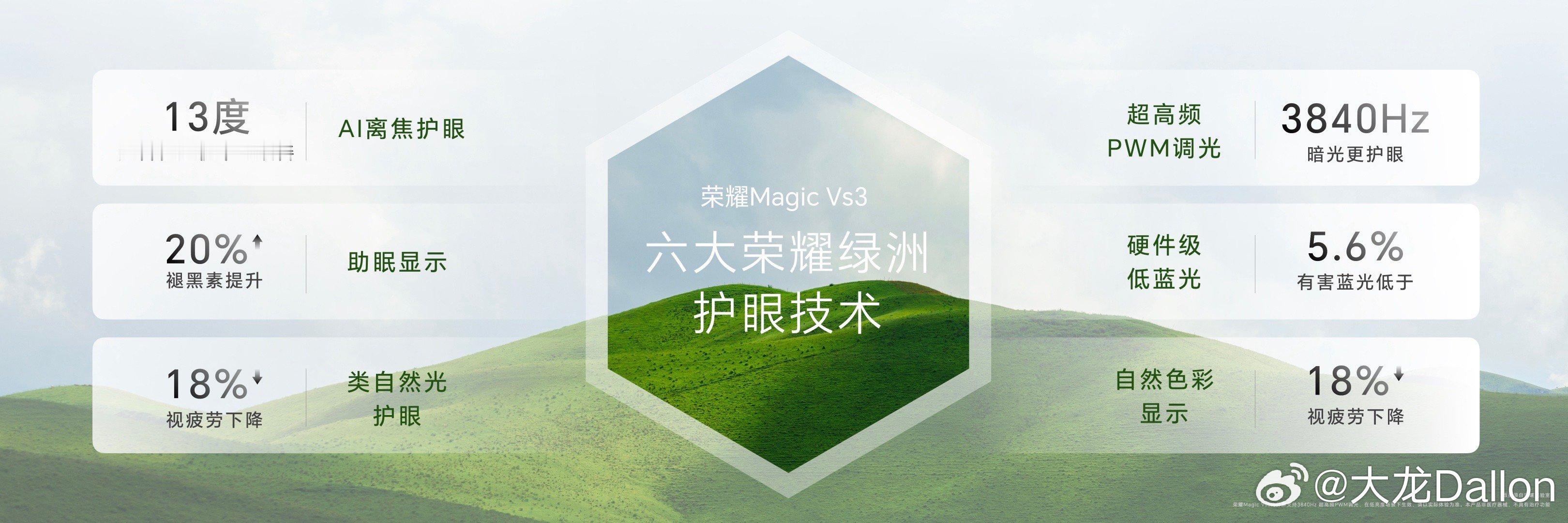 本次还有#荣耀Magic Vs3#镜头模组采用极具辨识度的极目星环设计,拥有祁连雪、苔原绿、绒黑色三款配色。