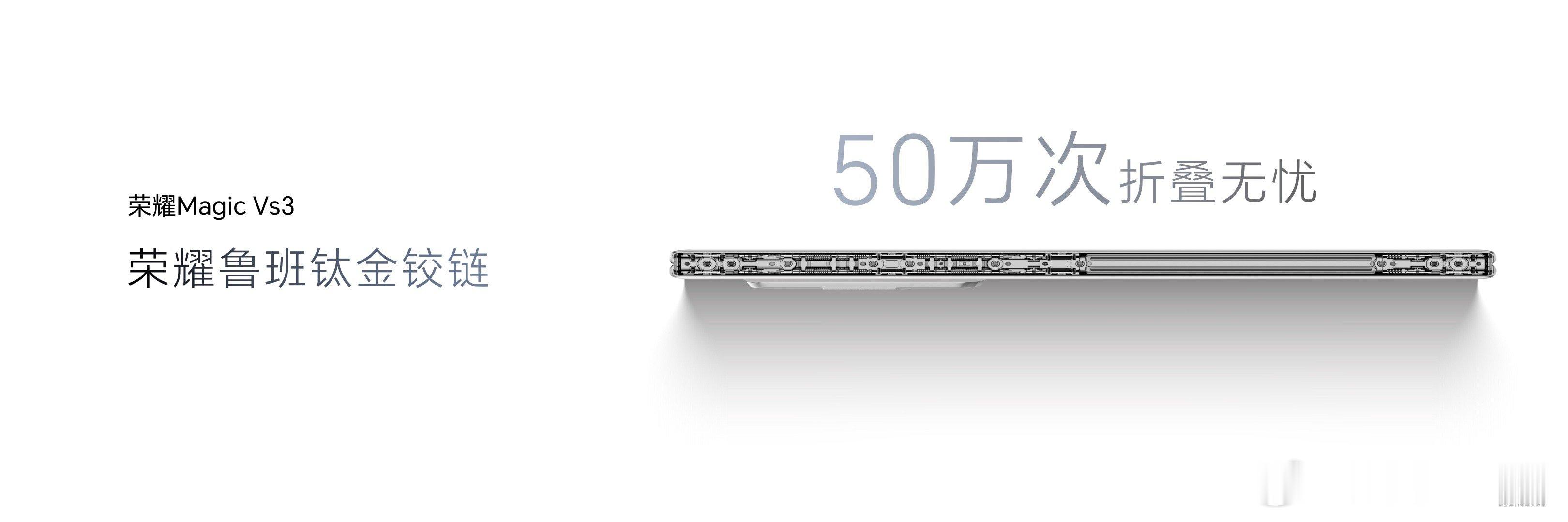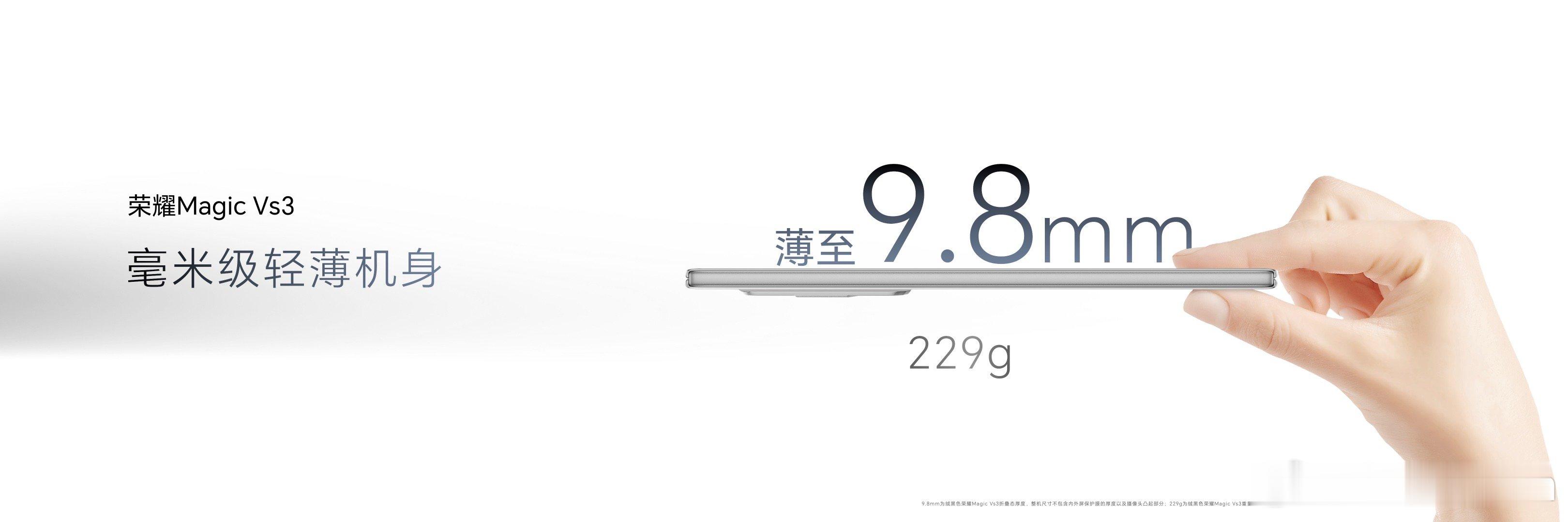荣耀Magic Vs3闭合态厚度仅9.8mm,重229克,搭载采用3D打印工艺制成的鲁班钛金铰链。电池方面,支持50W无线快充,配备5000mAh青海湖电池。