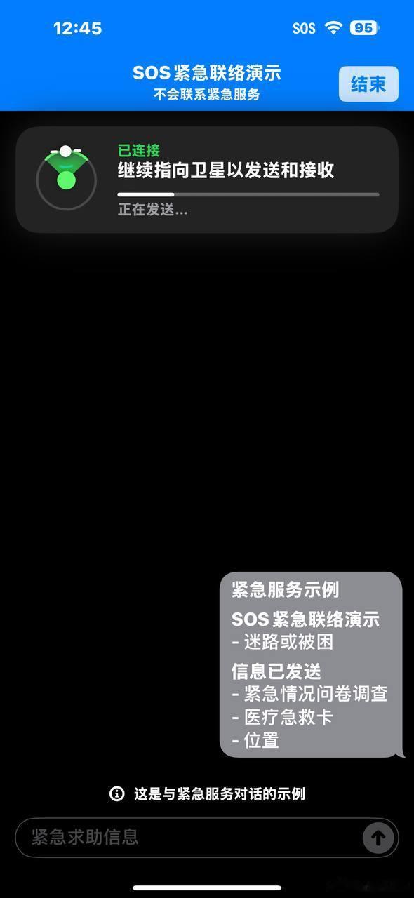 根据网友爆料,iPhone似乎在测试大陆版本的连接卫星的应急通讯服务,不过目前截图部分为演示DEMO。