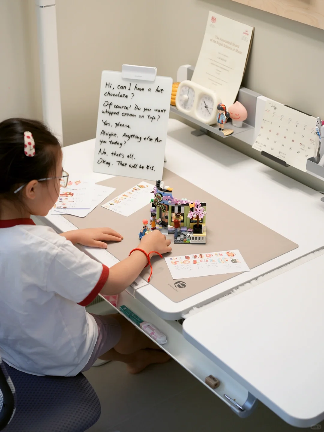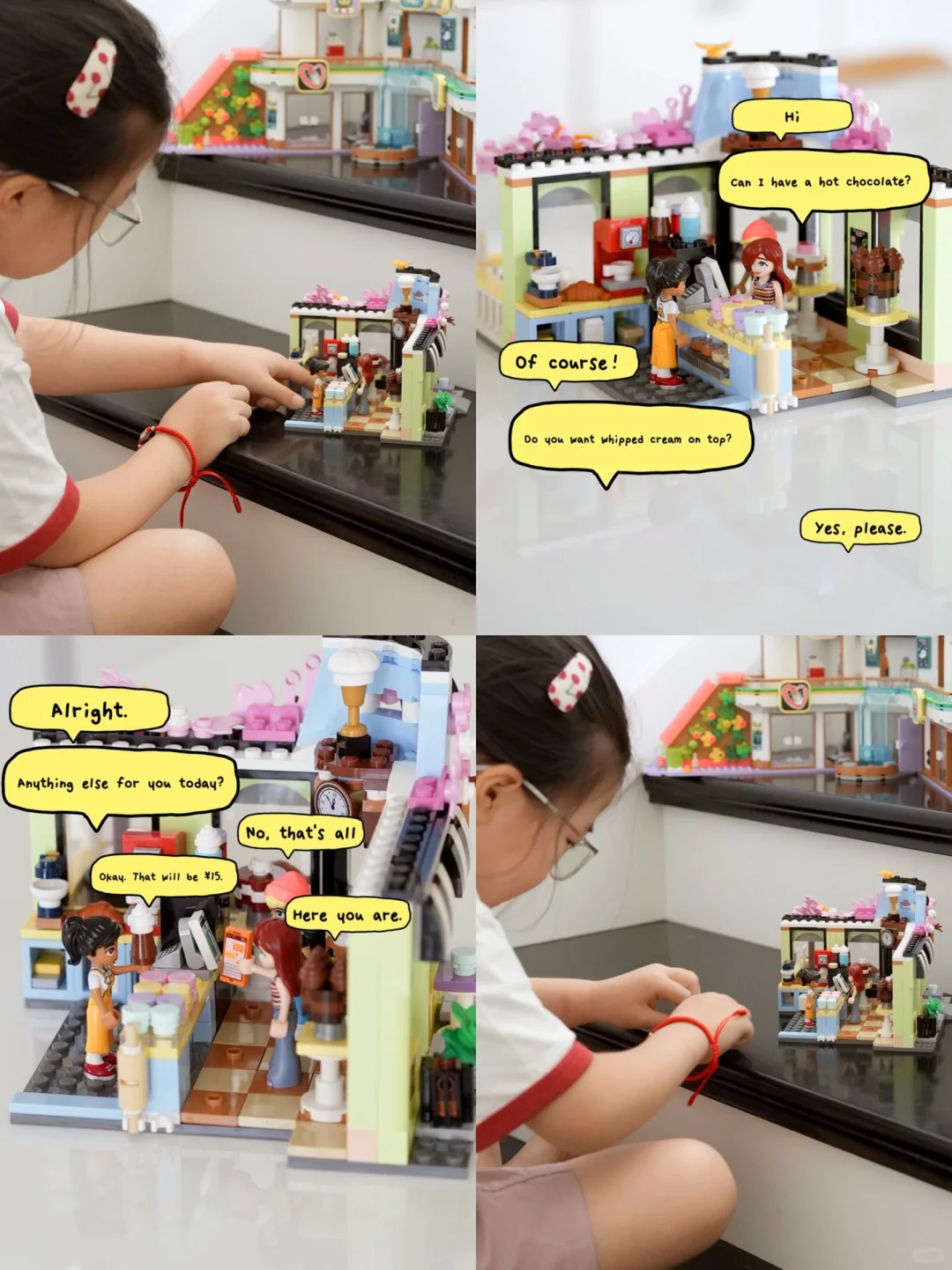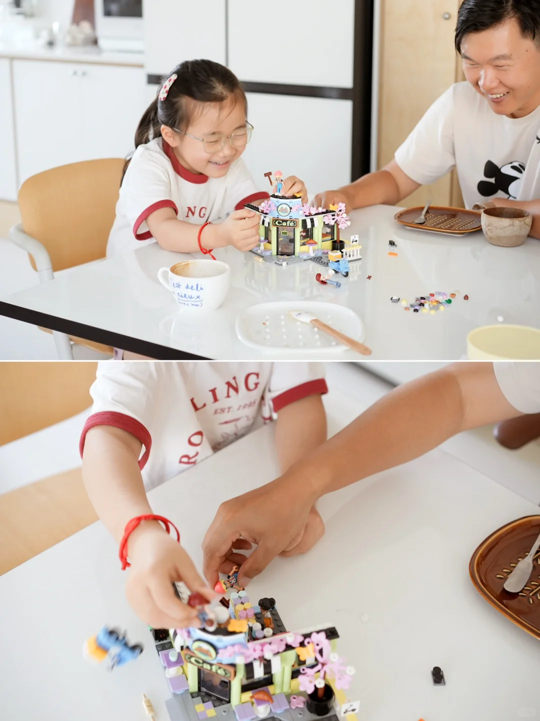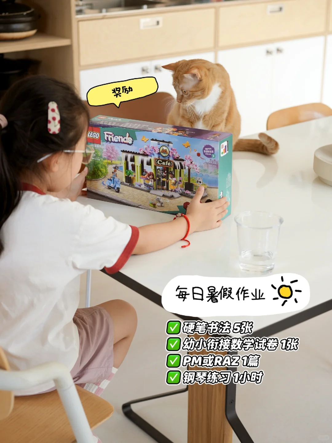 暑假比较让父母头疼的事情,大概率就是不去幼儿园的这每周5x8h,该干什么? 我目前给孩子每天适当安排了一些暑假作业: ✍🏻硬笔书法 5张 ✍🏻幼小衔接数学试卷 1张 💬PM或RAZ 1篇 🎹钢琴 1小时 ➰中间休息的时间以及完成任务后剩余的时间,她都可以自己安排 ➰在作业完成比较好的情况下,我还会给她暑假奖励,在女孩玩具里,我个人很偏爱买一些乐高套装,带孩子边玩边学 乐高好朋友系列就很适合6-12岁的女孩子,有各种主题能够激发她们的好奇心,而且好看的配色和过家家她们真的会很喜欢 这次选的,是她很喜欢的—☕️乐高心湖城咖啡馆(42618) 她一直梦想开一家这样的咖啡店,所以即使在碎片时间也忙着搭建,希望能尽快搭完这个主题 今年买的2套心湖城主题可玩性都很高,另一个是两层楼的商场,可以和这个咖啡馆结合在一起 ☕️单个场景的这套咖啡厅价格很美丽,里面的人物角色还不少,小人仔就有三个 这套场景设计得和真实咖啡馆相差无几👇🏻 ✔️有点餐区、烘焙区、户外用餐区,门口可以停送餐用的摩托车 ✔️里面收银机、打蛋器、小烤箱、扫帚这些用具都有 ✔️咖啡馆里吃的也应有尽有,甜甜圈、羊角包、马卡龙什么的 ✔️小人仔可以戴上头盔,骑着小摩托车去送餐 细节做得很丰富,我们家孩子搭完后会用乐高积木过家家 在过家家的环节里,我们会给她融入一些有场景的英语学习 引导她适应开口,习惯说完整的句子,而不是一个个单词 ❤️这样的暑假奖励,既培养了孩子的动手动脑能力,满足孩子的好奇心 又能在玩乐中提升孩子的想象力、沟通表达能力,还有英语能力 相比起去外面上课40多分钟200+,一套小型乐高玩具的性价比真的很不错