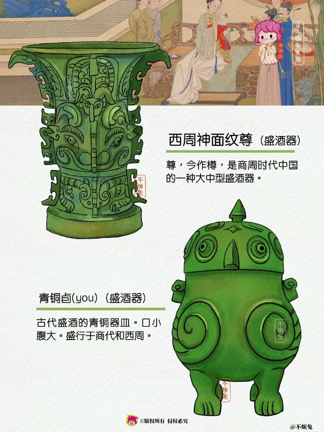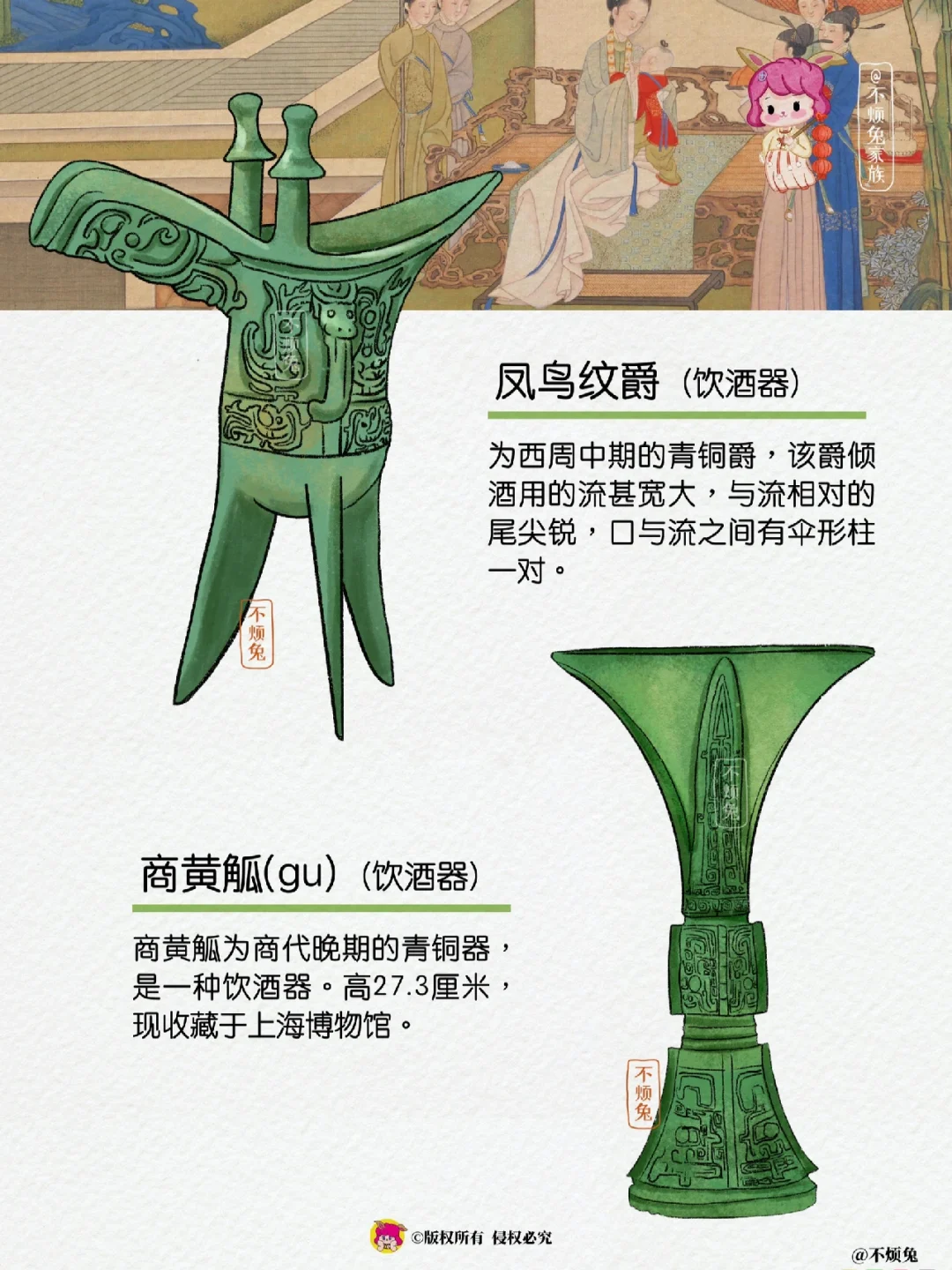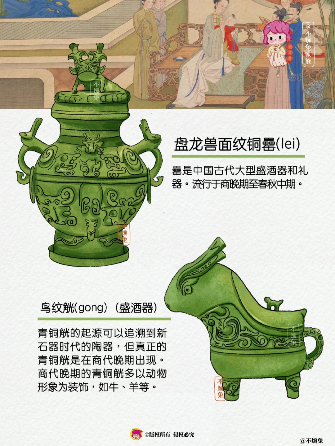 🟢殷商时代的青铜酒器形制丰富多样、造型独具匠心、美轮美奂。各式各样青铜酒器,不免让后人惊叹于古人想象丰富的艺术魅力。