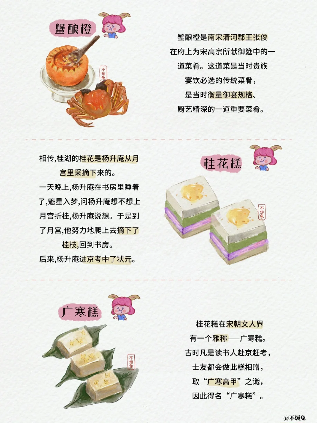 《东京梦华录》记载的美食多不胜数,其中有野狐。肉脯。鶏。梅家鹿家鹅鸭鶏兔肚肺鳝鱼包子。鶏皮。腰肾。鶏碎。毎个不过十五文。曹家从食。至朱雀门。旋煎羊。白肠。鲊脯。(火赞)冻鱼头。姜豉(枼刂)子。抹臓。红丝。批切羊头。辣脚子。姜辣萝卜。夏月麻腐鶏皮。麻饮细粉。素签沙糖。冰雪冷元子。水晶皂儿。生淹水木瓜。药不瓜。鶏头穰沙糖。菉豆。甘草冰雪凉水。荔枝膏。广芥瓜儿。醎菜。杏片。梅子姜。莴苣笋。芥辣瓜儿。细料馉饳儿。香糖果子。间道糖荔枝等等。《东京梦华录》一书共提到的一百多家店铺中,城中有“白矾楼”(后改为“丰乐楼”)、“潘家楼”、“欣乐楼”(即“任店”)、“遇仙正店”、“中山正店”、“高阳正店”、“清风楼”、“长庆楼”、“八仙楼”、“班楼”、“张八家园宅正店”、“王家正店”、“李七家正店”、“仁和正店”、“会仙楼正店”等。