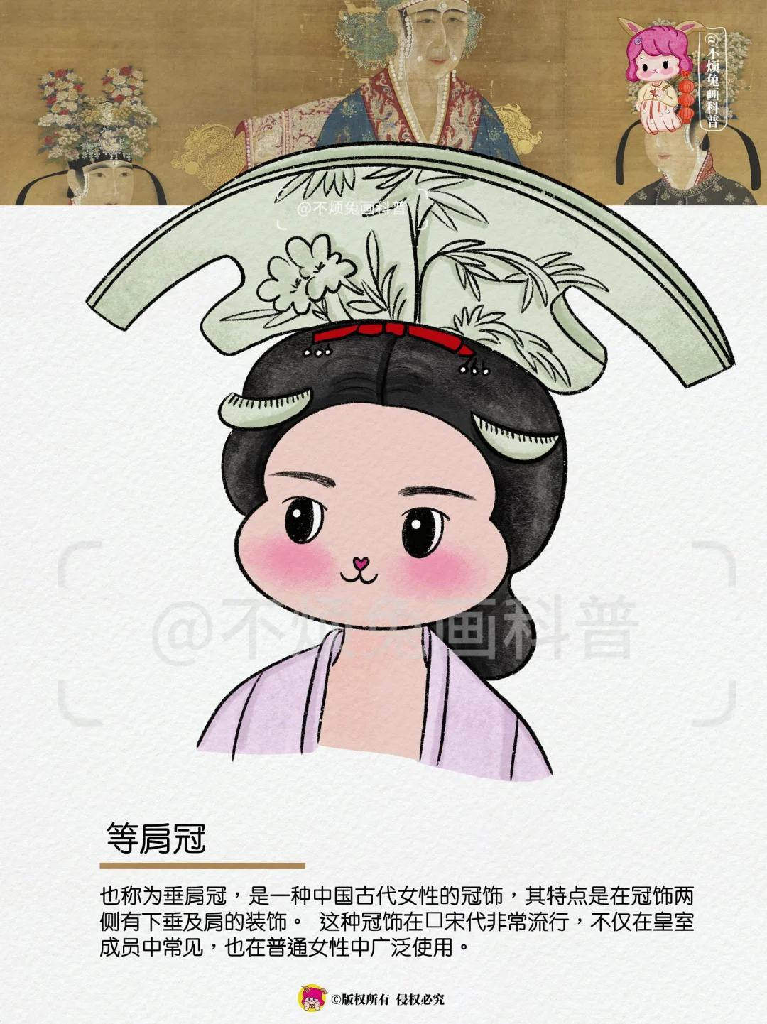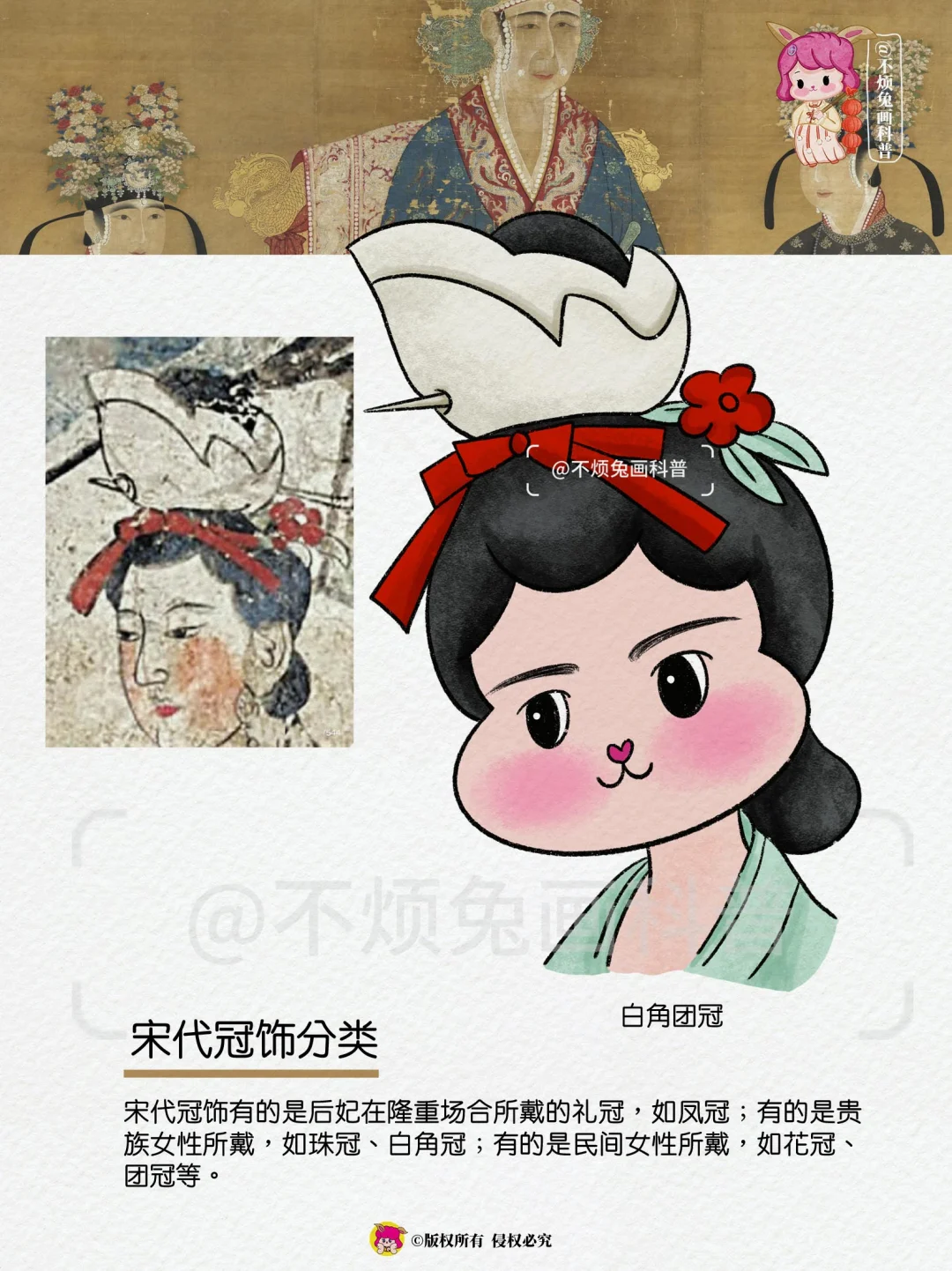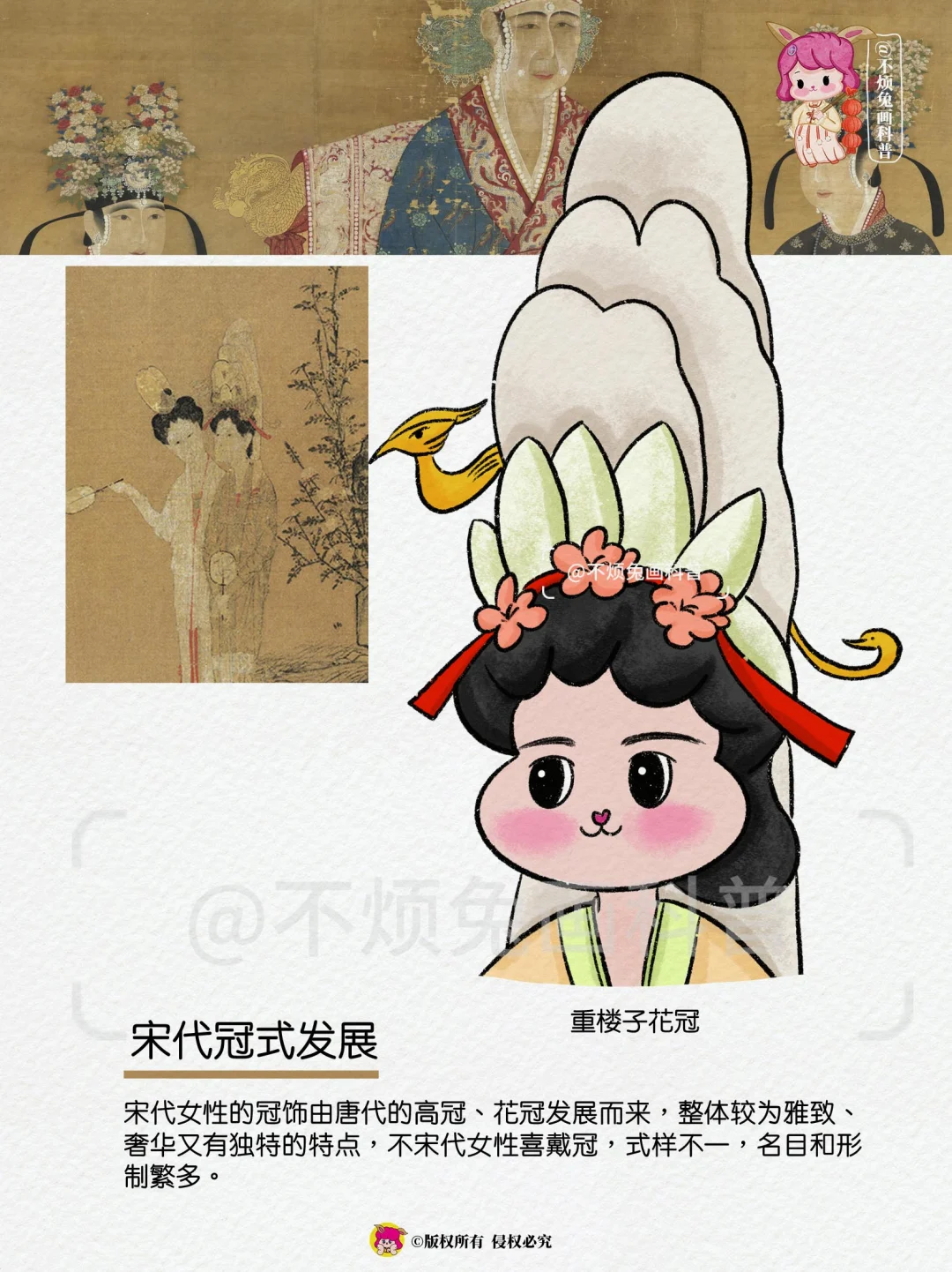 🪞宋代冠式发展 宋代女性的冠饰由唐代的高冠、花冠发展而来,整体较为雅致、奢华又有独特的特点,不宋代女性喜戴冠,式样不一,名目和形制繁多。 - 🪞宋代冠饰分类 有的是后妃在隆重场合所戴的礼冠,如凤冠;有的是贵族女性所戴,如珠冠、白角冠;有的是民间女性所戴,如花冠、团冠等。 - 1️⃣重楼子花冠 2️⃣白角团冠 3️⃣莲花冠 4️⃣水晶团冠 5️⃣白角山口冠 6️⃣等肩冠 7️⃣百花如意冠 8️⃣铺翠花冠 9️⃣攒云五岳冠 -