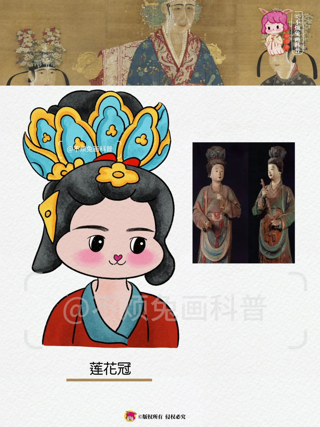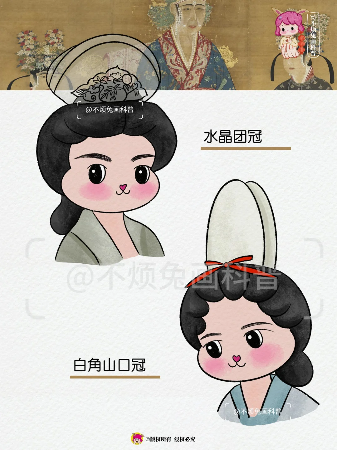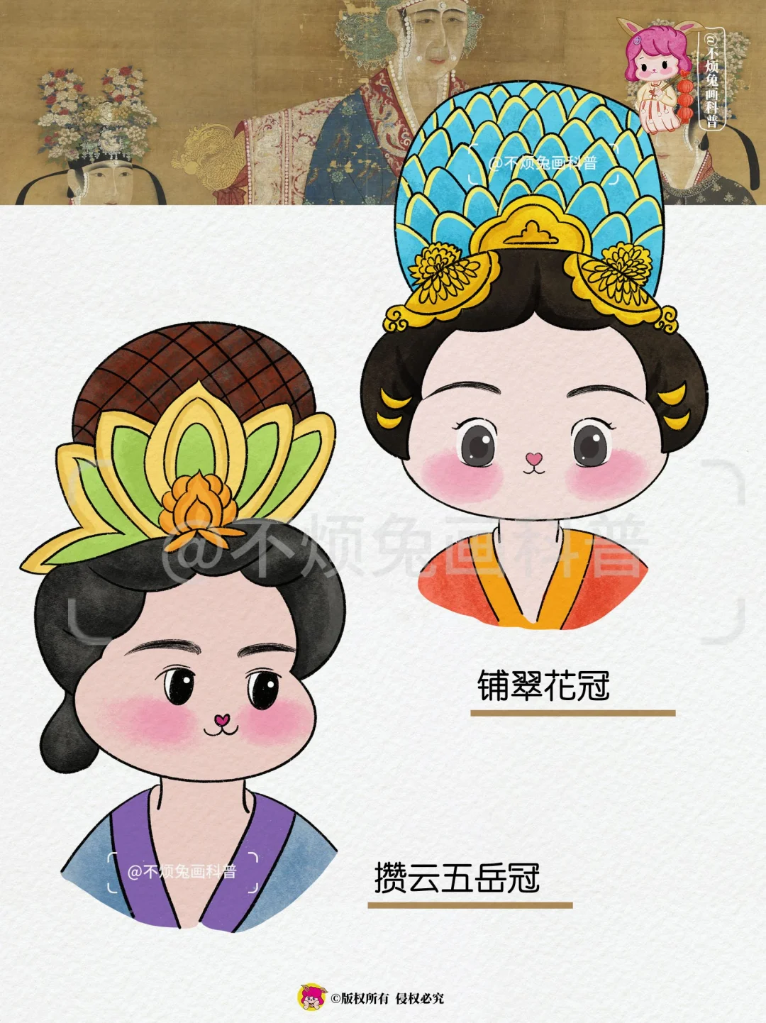 🪞宋代冠式发展 宋代女性的冠饰由唐代的高冠、花冠发展而来,整体较为雅致、奢华又有独特的特点,不宋代女性喜戴冠,式样不一,名目和形制繁多。 - 🪞宋代冠饰分类 有的是后妃在隆重场合所戴的礼冠,如凤冠;有的是贵族女性所戴,如珠冠、白角冠;有的是民间女性所戴,如花冠、团冠等。 - 1️⃣重楼子花冠 2️⃣白角团冠 3️⃣莲花冠 4️⃣水晶团冠 5️⃣白角山口冠 6️⃣等肩冠 7️⃣百花如意冠 8️⃣铺翠花冠 9️⃣攒云五岳冠 -