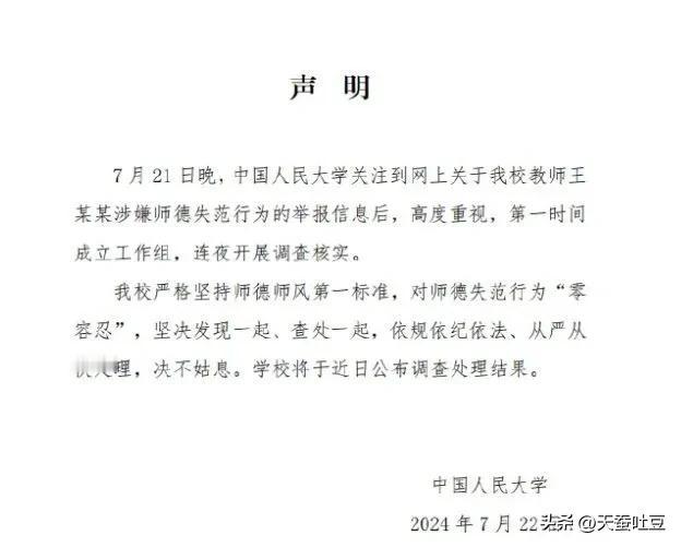 人大的声明连个公章都没有,安徽学校那个都有公章,学校处置有什么用,要是社会上发生猥亵,早判刑了。处理结果,降个级,记个大过?给受害人换个导师是不是然后该给受害人好处,私底下跟受害人谈论,让她不要追究,有些人该怎么过还怎么过,别到最后结果是光依规不依法。 然后过几天热度就下来了,就当什么事也没发生,对受害人力度再加一点,过不了几天,然后受害人拍视频不追究责任了 把他调走,发公章说个处理结果,过几个月几天,热度就下去了,然后大家该怎么过还怎么过,为了吃香,再把他调回来,老套路了都,近几年发生的这种事情,是不是都是这种处理方式,我们不是傻子,眼不瞎, 要放到以前,包青天直接狗头铡伺候,到时候为了点那些文学论文知识,干点那丑事,上面高层为了那点儿关系维护他。 别辜负了人民二字,别辜负了老一辈辛苦建立的新中国。#中国人民大学回应教师王某某涉嫌师德失范# #王迪#