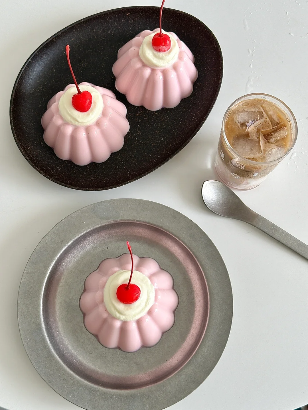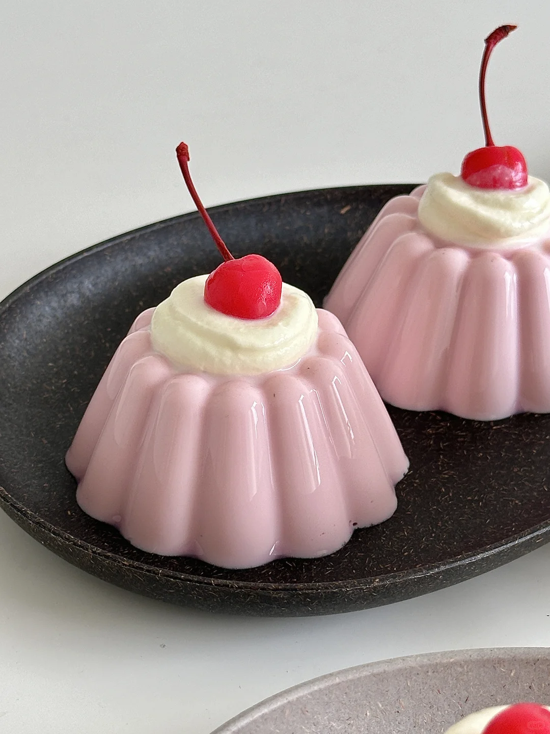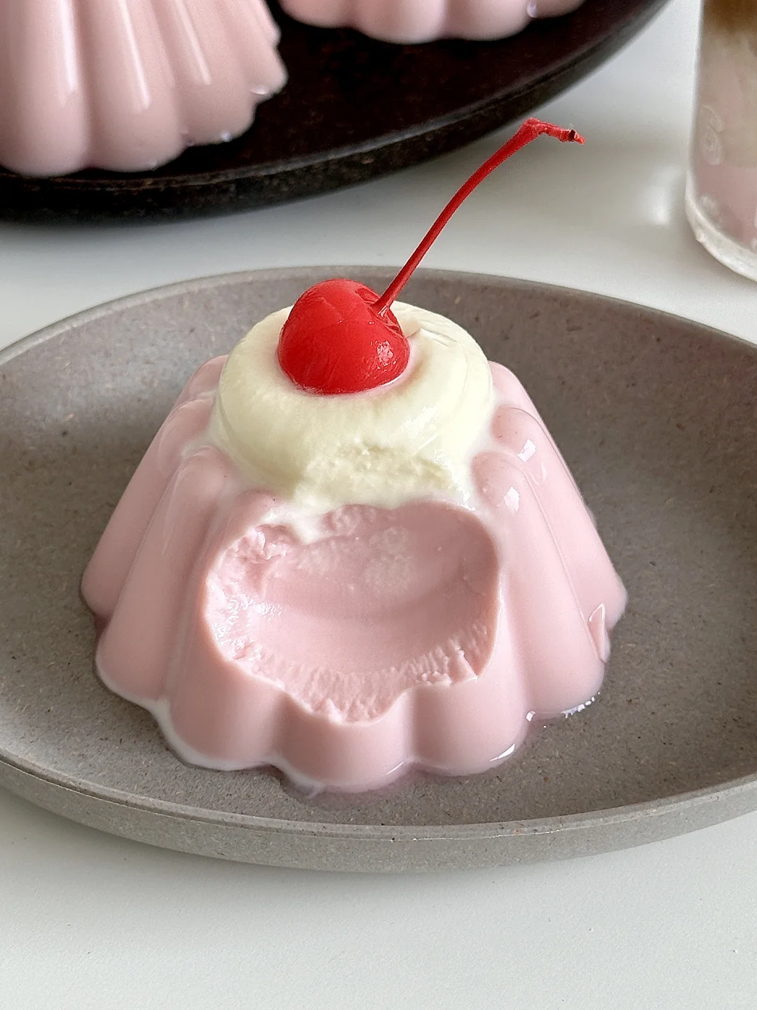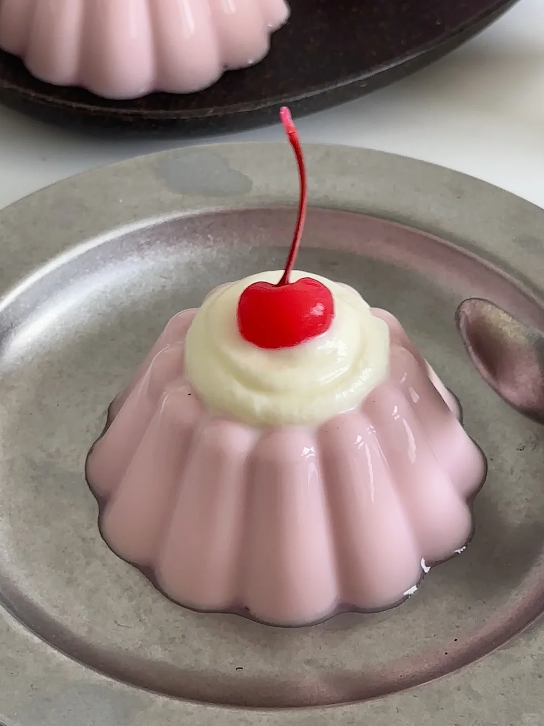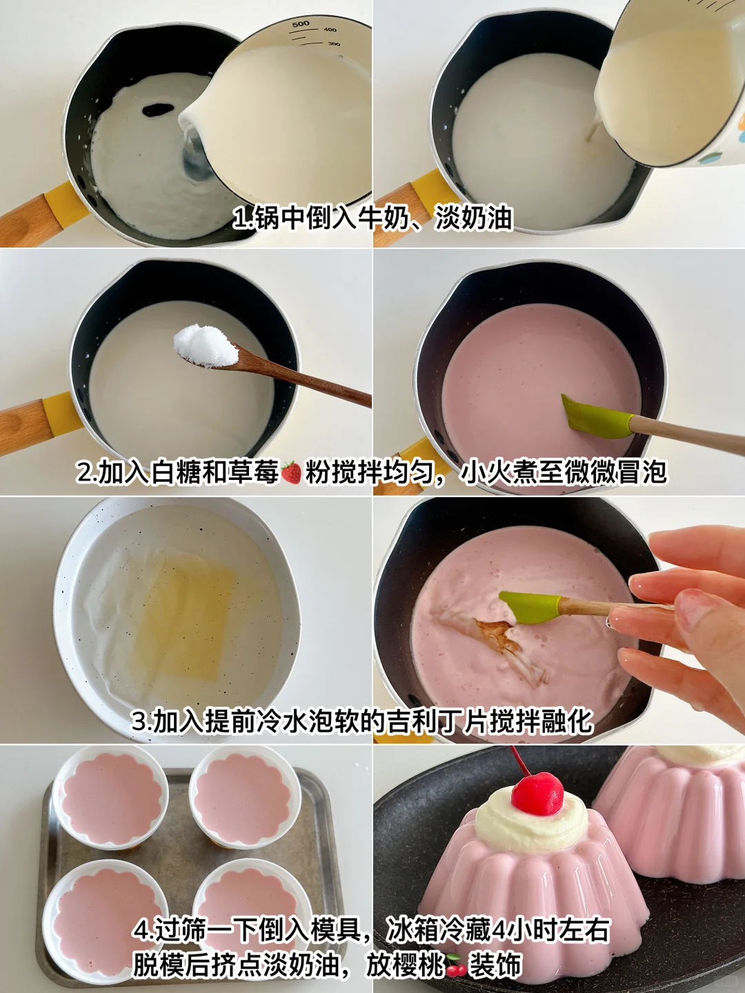 🧊冰冰凉凉入口即化的奶冻 下午茶来一个也不错 做法简单🤓只要十分钟就Ok了 🍒食材: 牛奶330g 淡奶油150g 白糖25g 草莓粉10g 吉利丁片10g 🧑🏻🍳步骤: 1. 锅中倒入牛奶、淡奶油、糖和草莓粉搅拌均匀 2. 小火煮至微微冒泡🫧 3. 加入提前冷水泡软的吉利丁片搅拌融化 4. 过筛一下,倒入模具,入冰箱冷藏4小时左右 5. 脱模后挤点奶油,再放樱桃装饰即可