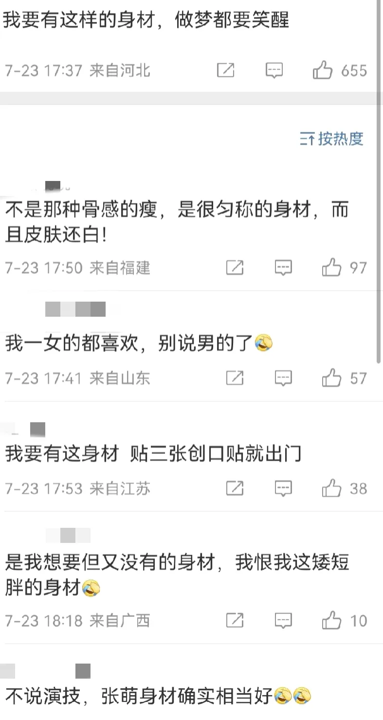 网友们看了,纷纷留言: 要是我有这身材,做梦都能笑醒。 不是干瘪的瘦,是匀称的美,皮肤还超白! 我要有这身材,贴个创可贴就敢出门。 不谈演技,张萌身材真的一级棒。 的确,白皙、丰满、健康,视频里的美,大方得体。
