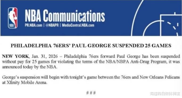 北京时间2月1日凌晨,NBA官方重磅官宣,费城76人球星保罗·乔治因违反联盟反兴奋剂条例,被处以无薪禁赛25场的严厉处罚,处罚即刻生效,从当日76人对阵鹈鹕的比赛正式开启执行。这一罚单成为本赛季NBA开出的最大规模禁赛处罚,不仅让乔治遭遇职业生涯重大危机,也给志在冲冠的76人带来不小的连锁震荡。