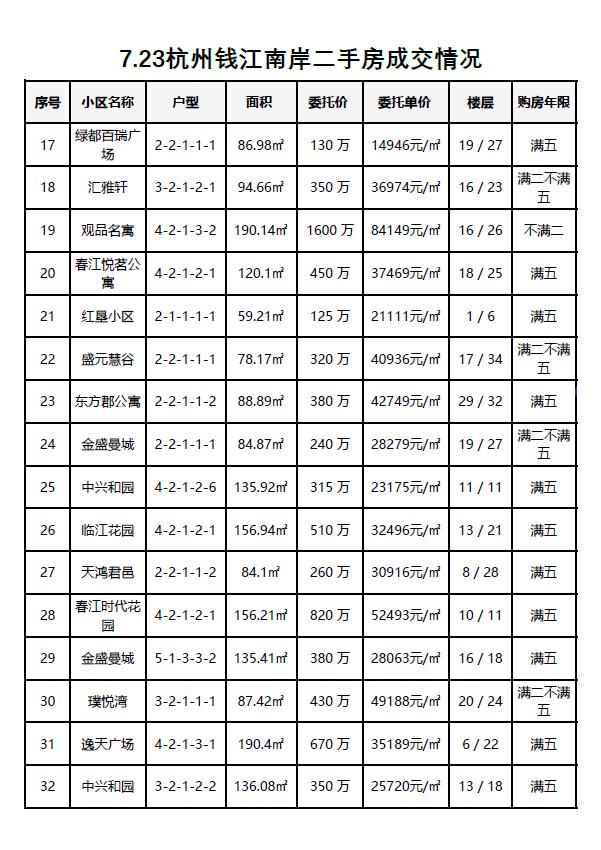 7.23杭州钱江南岸(滨江和萧山)二手房每日成交数据分享,昨日共成交32套,7月