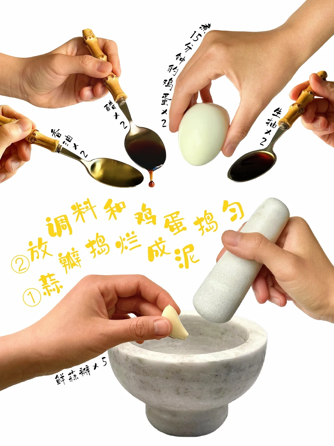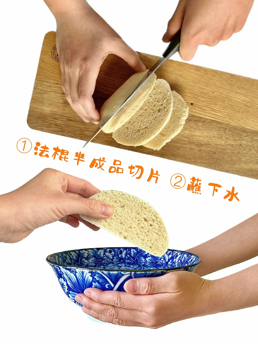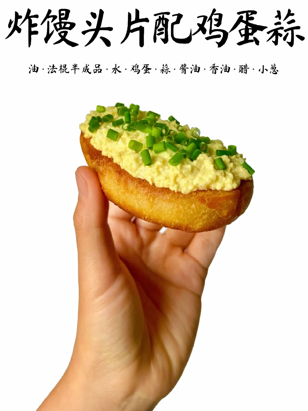 小时候吃全熟的煮鸡蛋 最爱就是配酱油香油醋料汁 能连着吃下四五个🤤 再做成鸡蛋蒜酱 加入大蒜的辛辣 和鸡蛋的软嫩在口中交织 味蕾得到极大的满足 开胃又过瘾! 👉Tips 夹在蒸馒头里或配炸馒头片均🉑 调味🉑按个人口味调整 香菜和小葱喜欢吃均🉑放 鸡蛋煮12-15分钟即🉑全熟 👉补充 这种法棍的半成品蒸出来是馒头 切片下热油锅就是炸馒头片