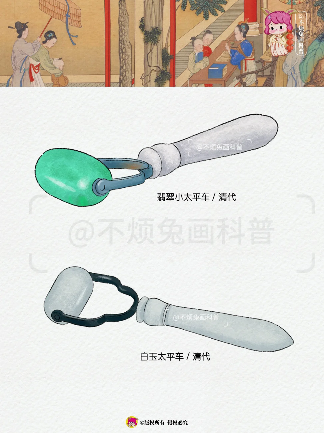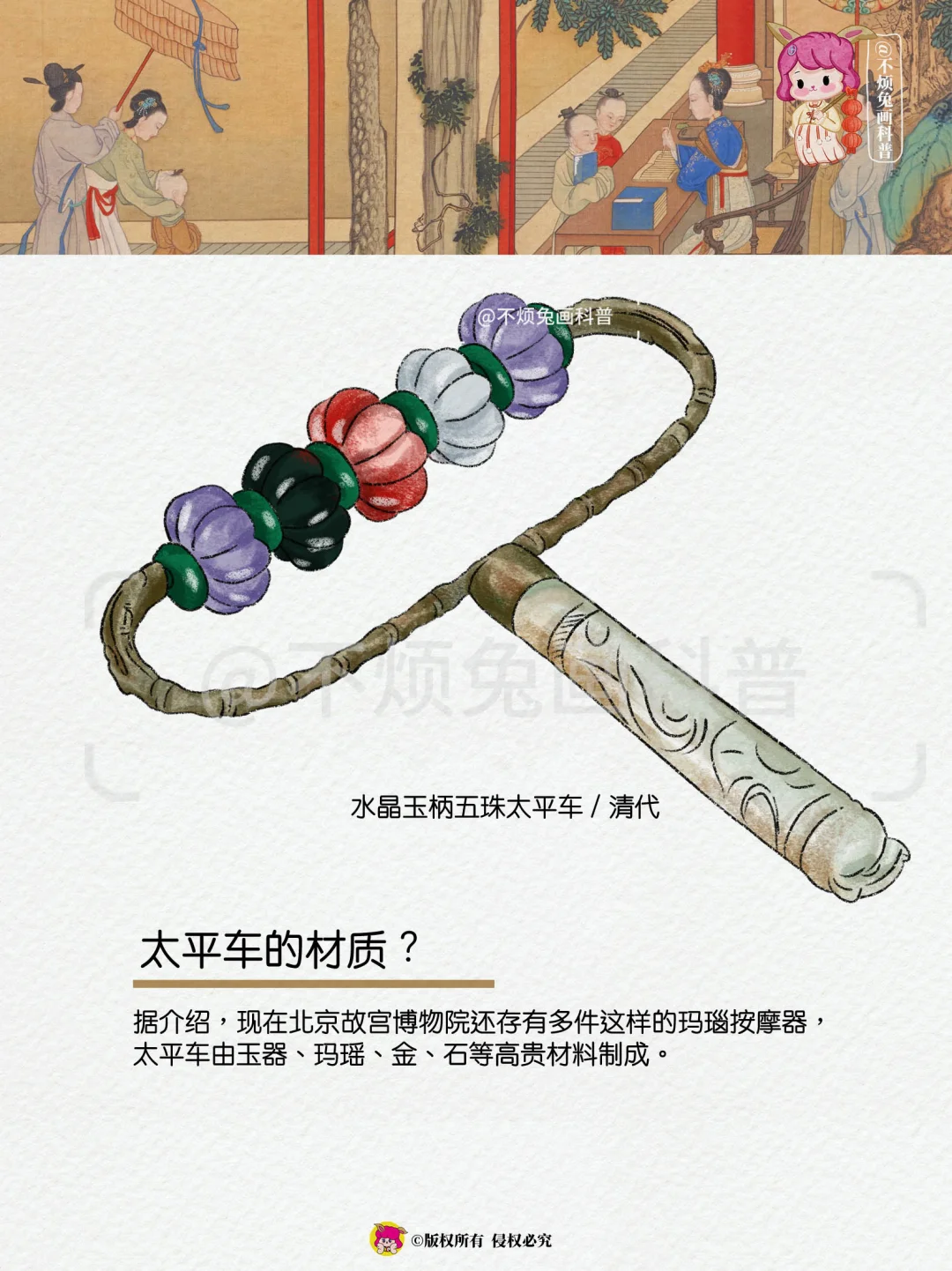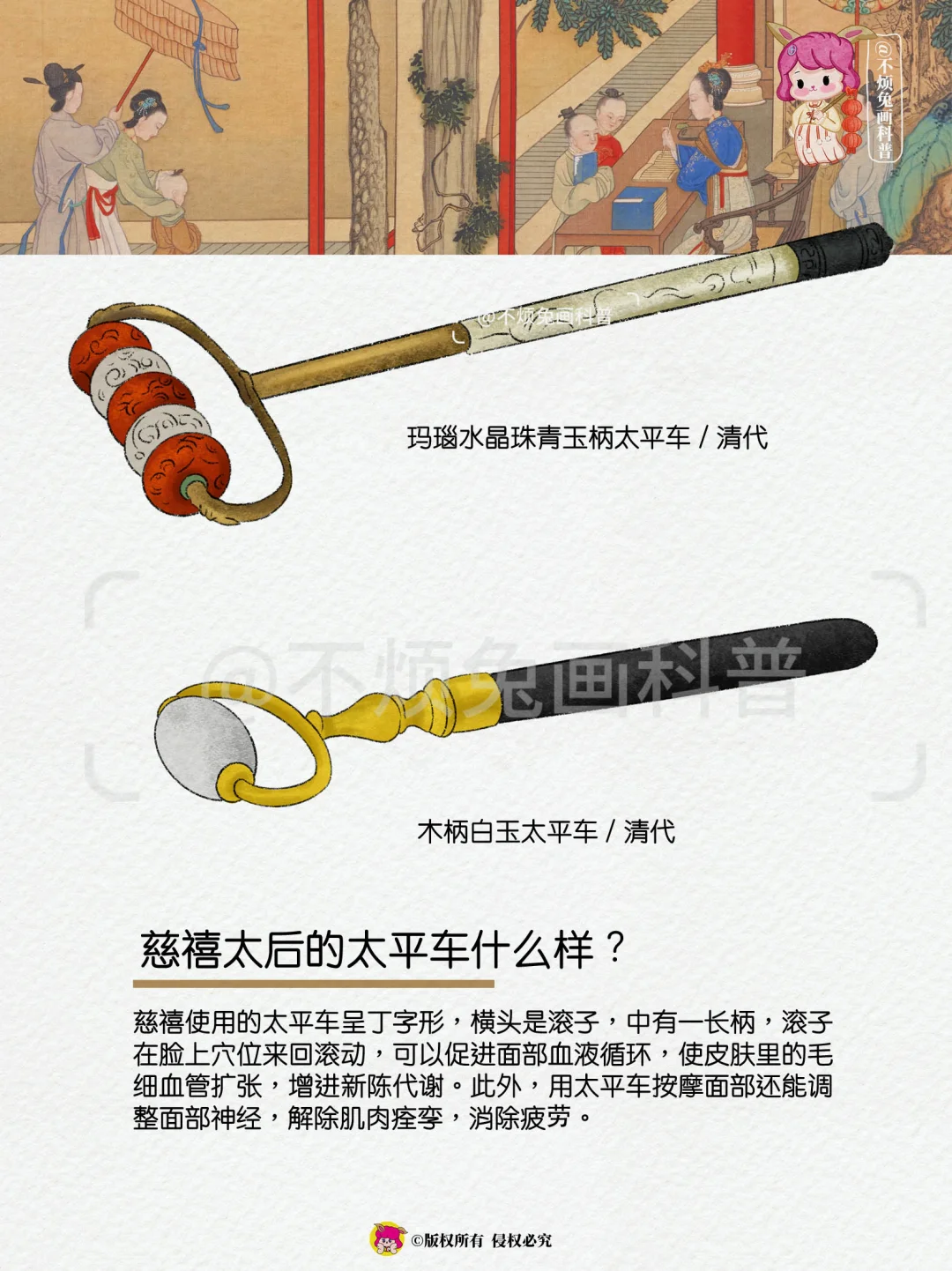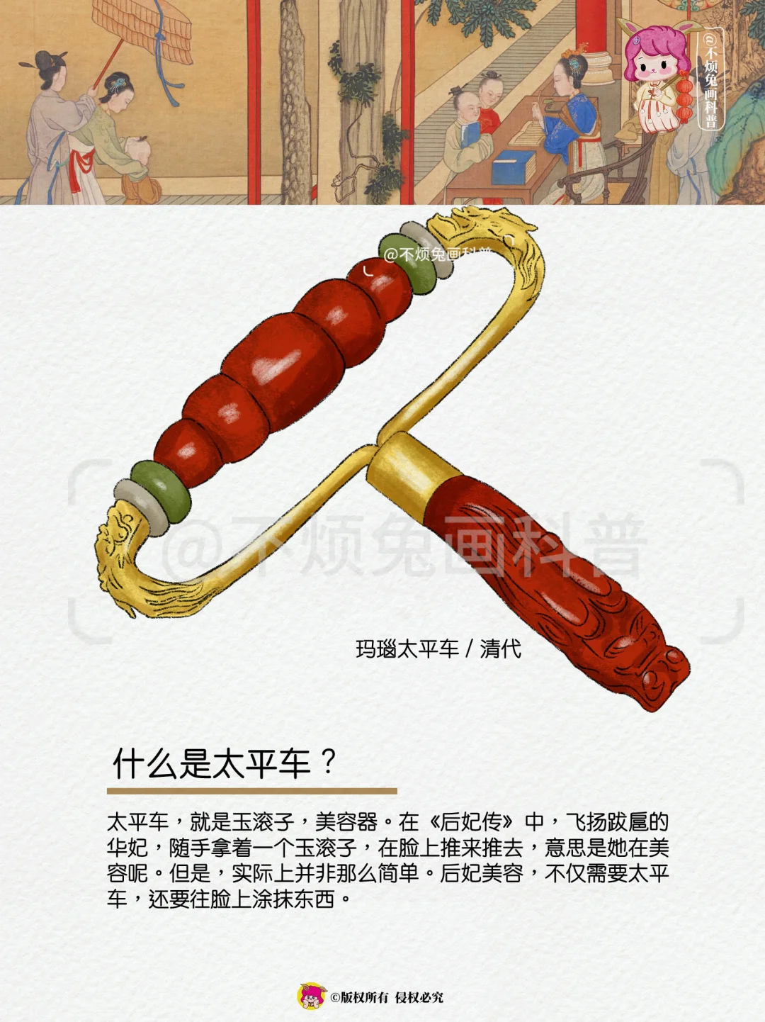 太平车,就是玉滚子,美容器。在《后妃传》中,飞扬跋扈的华妃,随手拿着一个玉滚子,在脸上推来推去,意思是她在美容呢。但是,实际上并非那么简单。后妃美容,不仅需要太平车,还要往脸上涂抹东西。