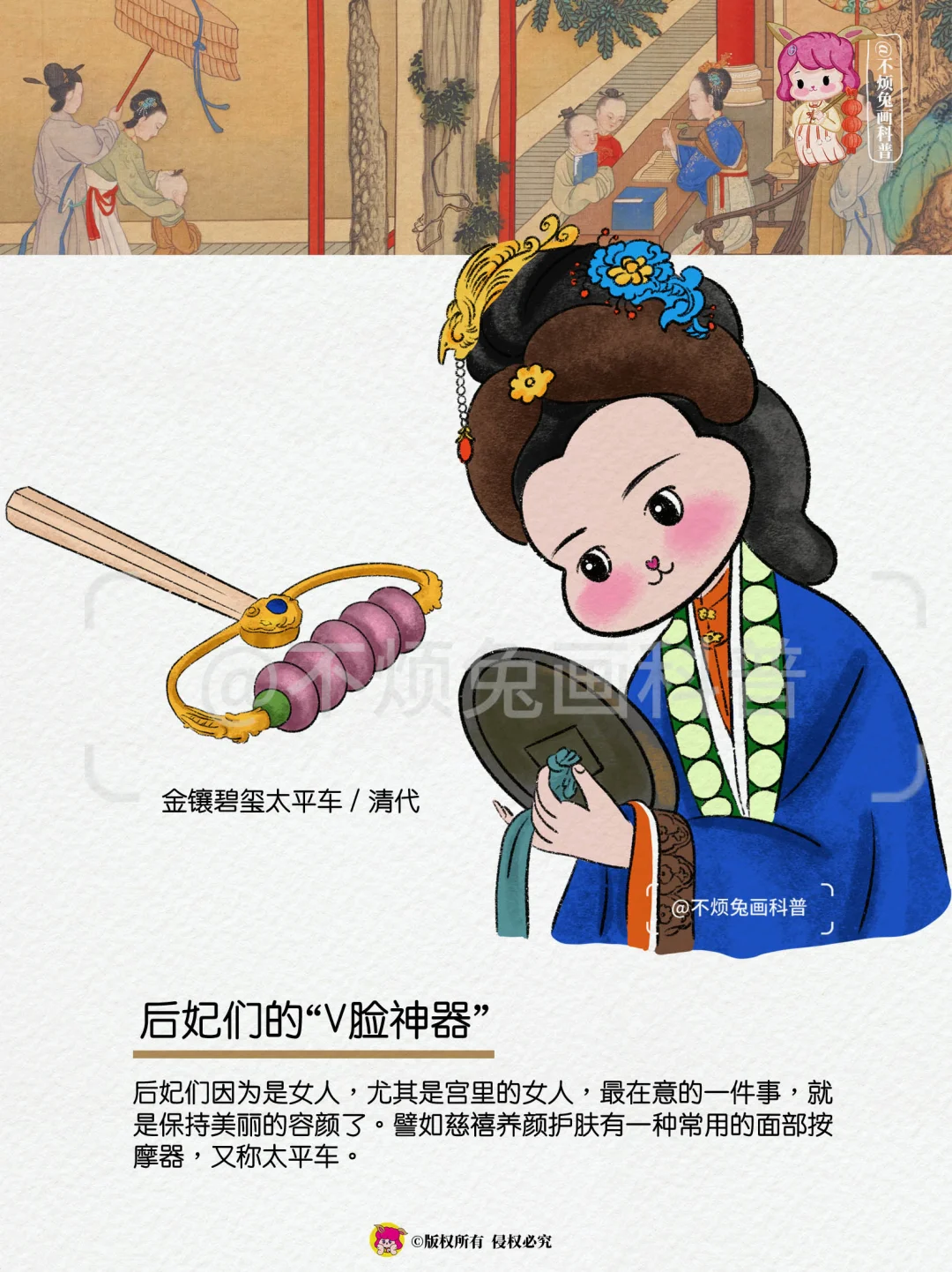 后妃们在意的一件事,就是保持美丽的容颜了。譬如慈禧养颜护肤有一种常用的面部美容器,又称太平车。