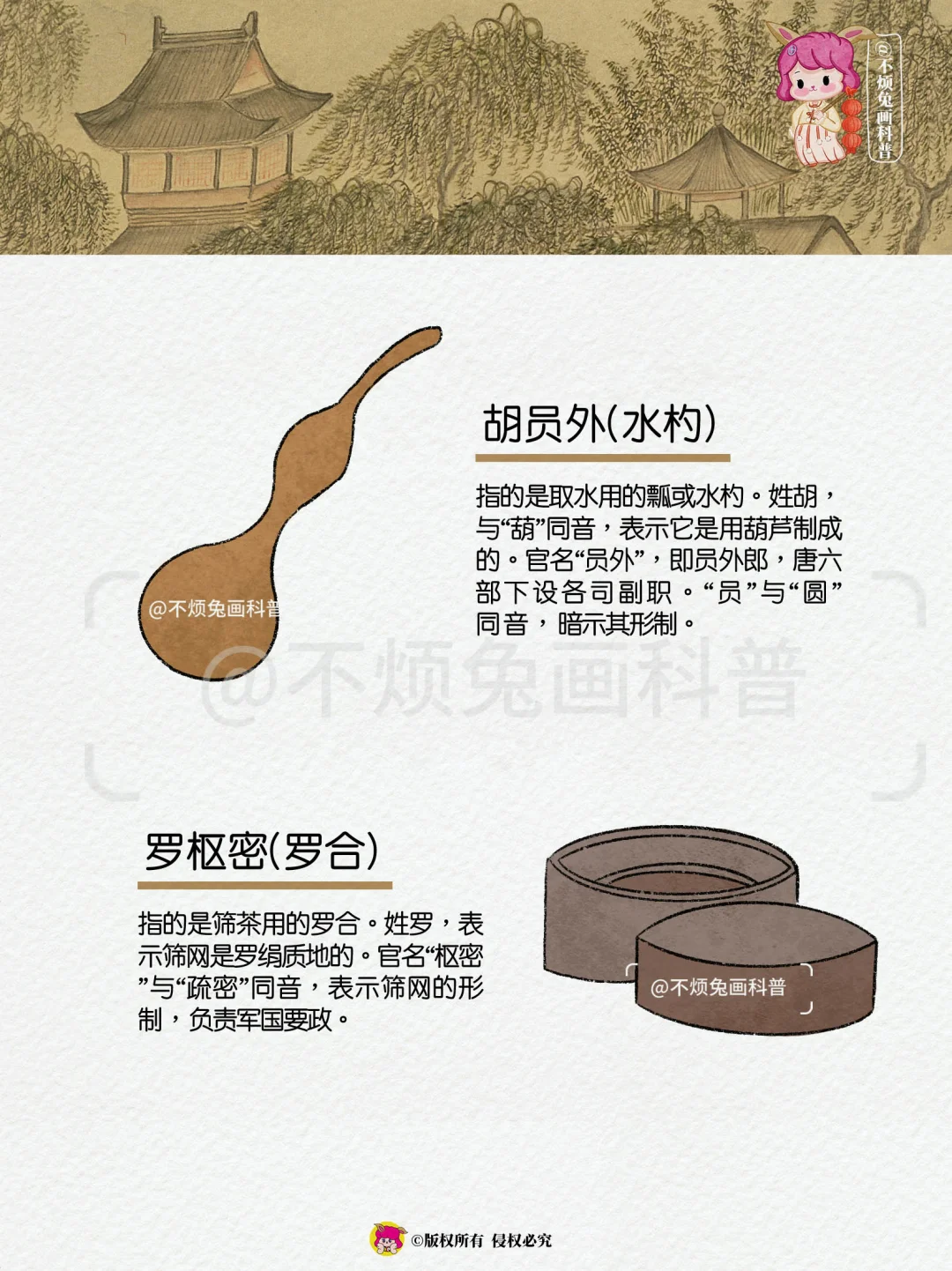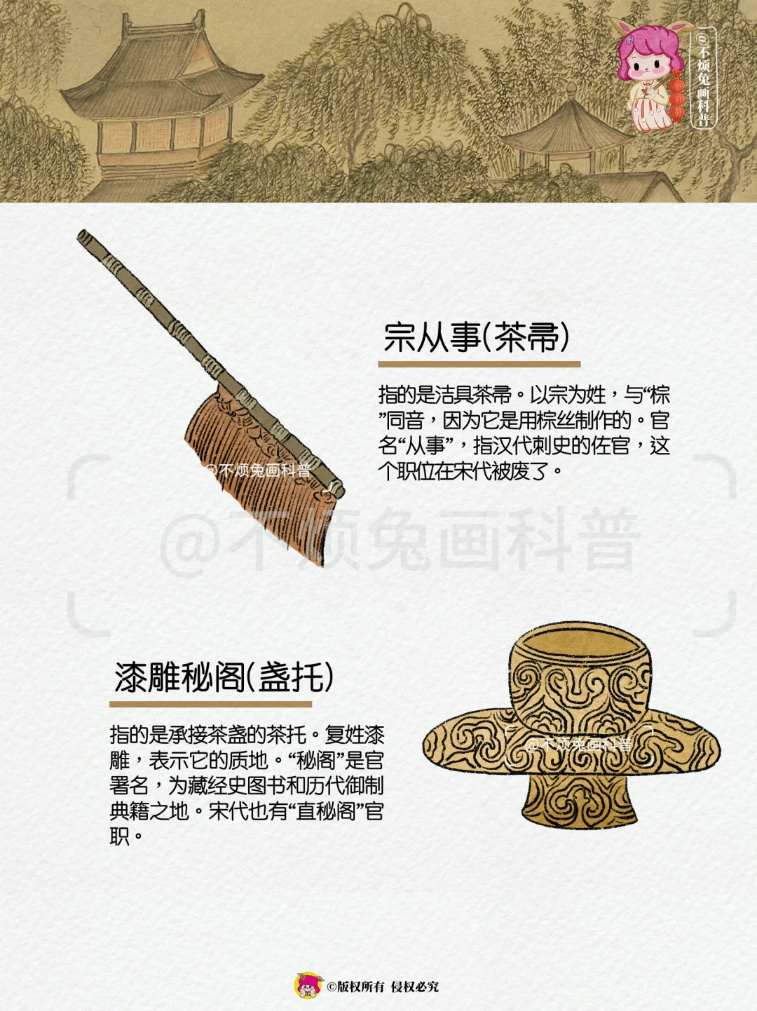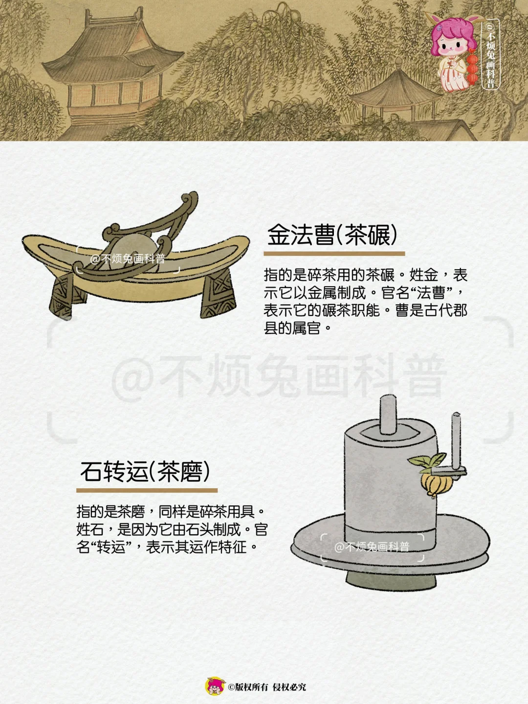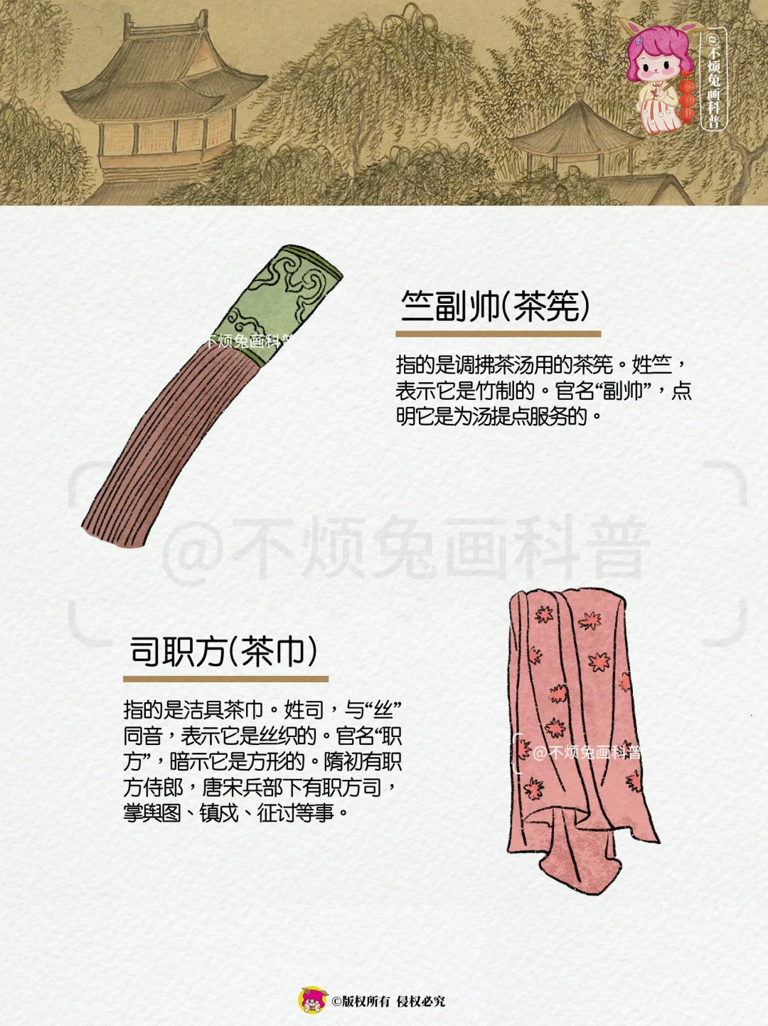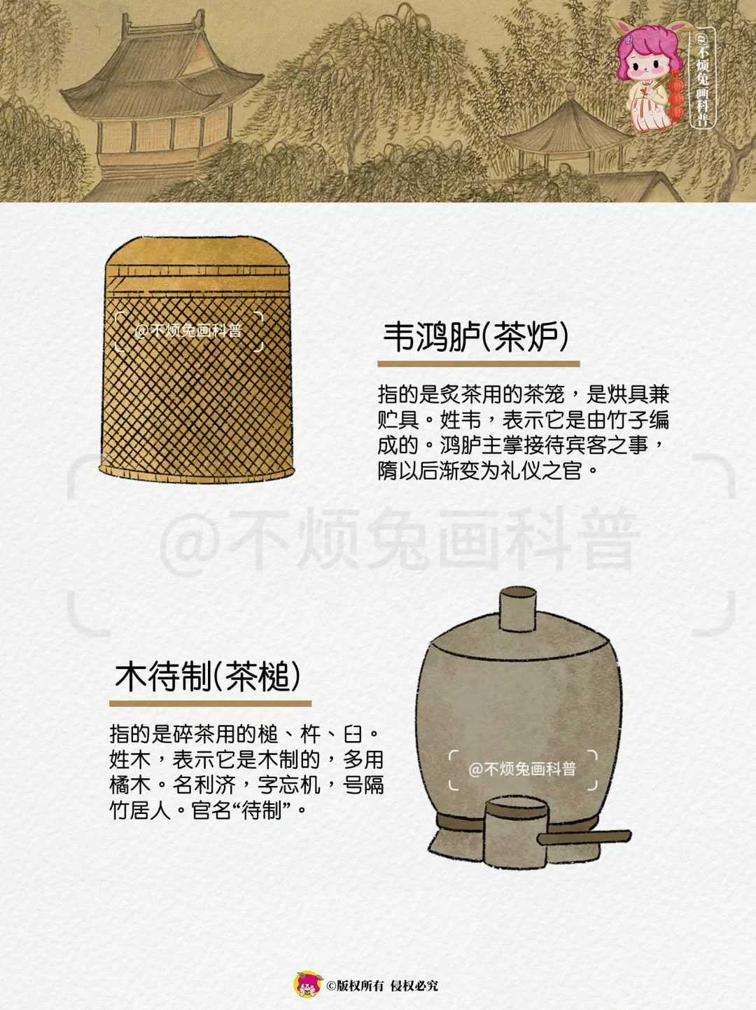 🍵审安老人在《茶具图赞》中描绘的“十二先生”,正是宋代饮茶用具简化版的拟人化。审安老人赐予它们姓名与字号,又给它们冠以官名,以此展现它们的质地、形制和作用。了解这形象有趣的“十二先生”之后,我们就能够大致理清宋代饮茶的流程,还能体会到,饮茶到了宋代,已经走向了艺术。 - 🔻韦鸿胪 🔻木待制 🔻金法曹 🔻石转运 🔻胡员外 🔻罗枢密 🔻宗从事 🔻漆雕秘阁 🔻陶宝文 🔻汤提点 🔻竺副帅 🔻司职方 -