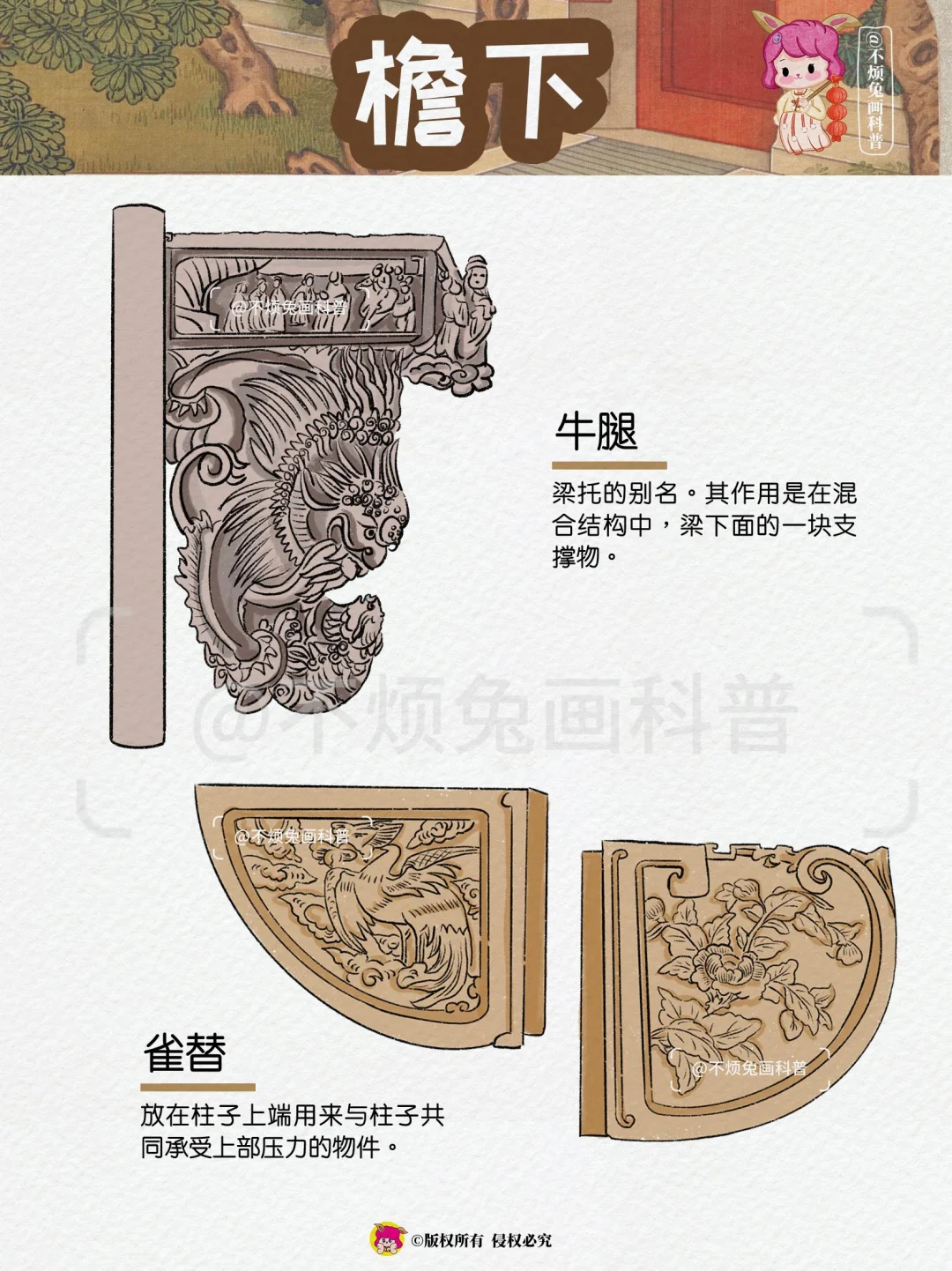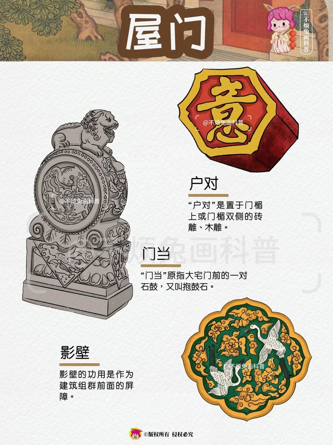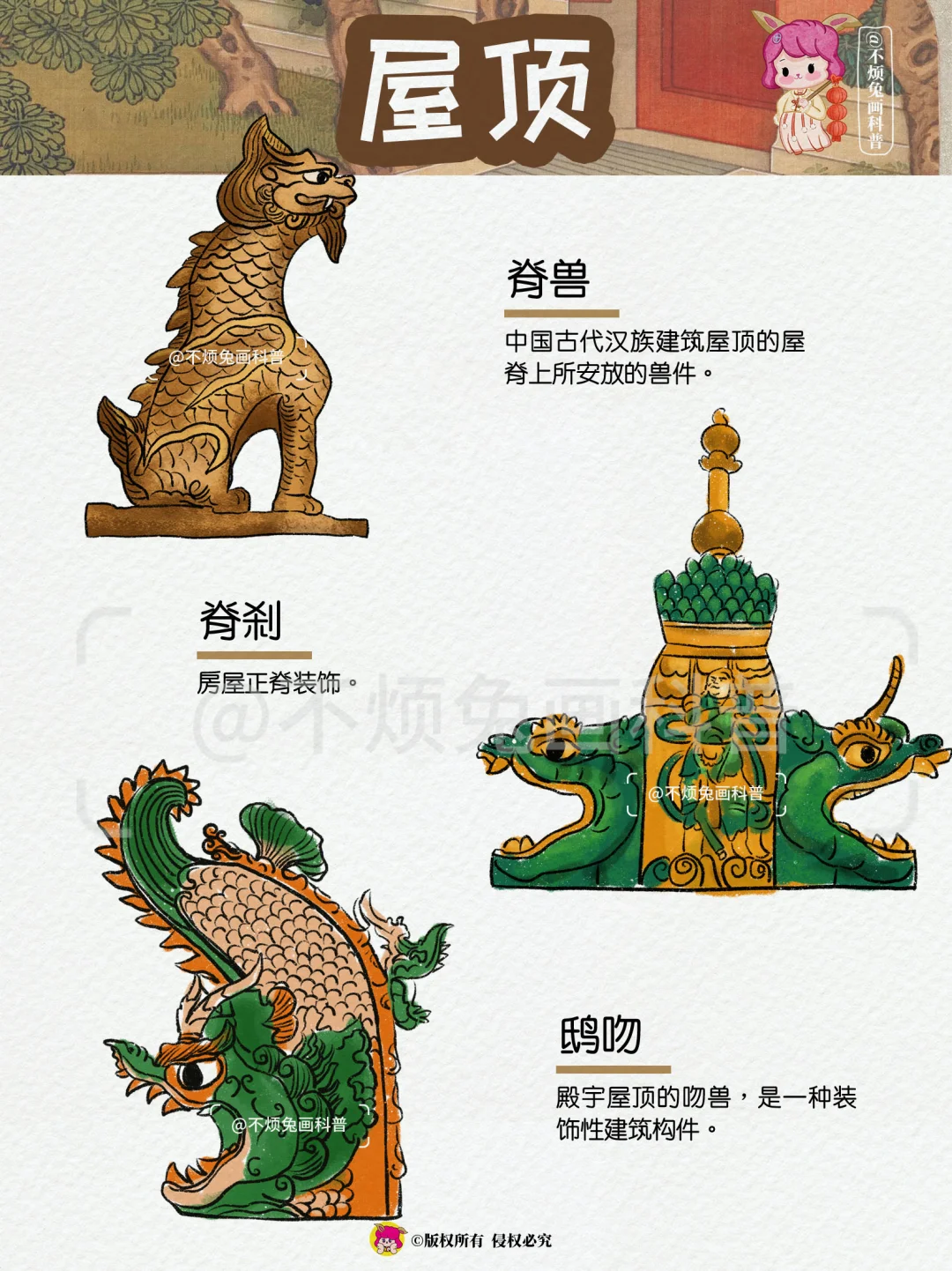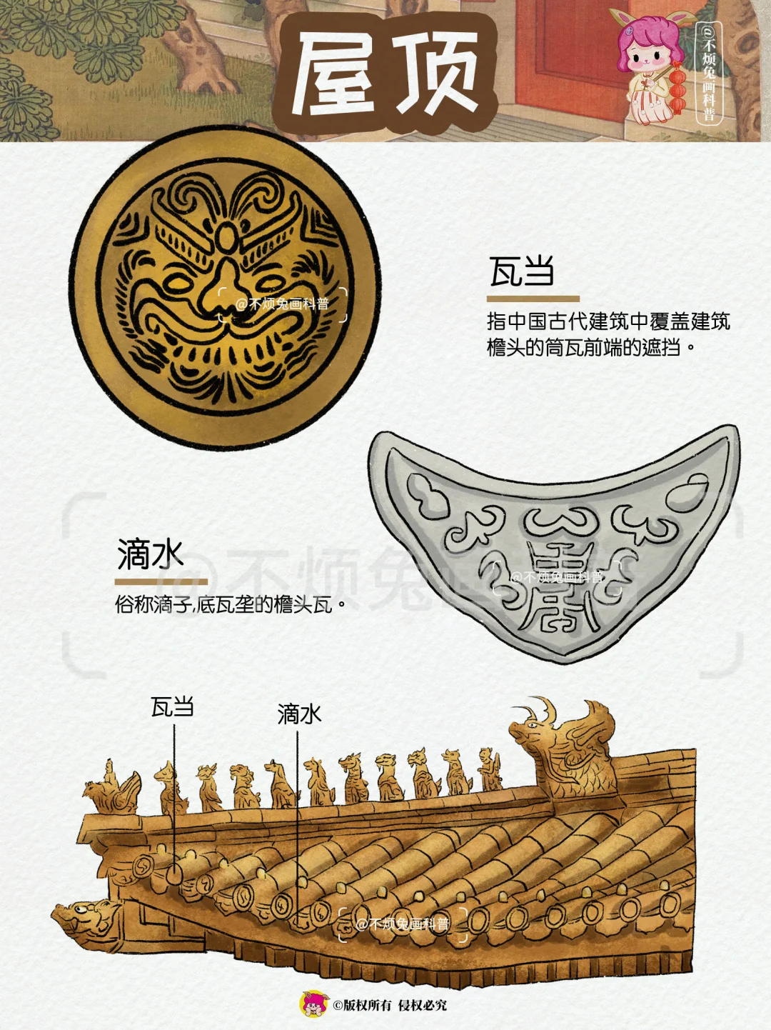🏡再也不怕弄混古建筑的构件了,跟着不烦兔一起来看古建筑吧! - 1️⃣屋顶 🔻脊兽 🔻脊刹 🔻鸱吻 🔻瓦当 🔻滴水 2️⃣屋檐 🔸飞檐 🔸风铎 🔸博风 🔸惹草 🔸悬鱼 3️⃣檐下 🔻牛腿 🔻雀替 🔻额枋 🔻垂花柱 🔻月梁 4️⃣屋门 🔸户对 🔸门当 🔸影壁 🔸辅首 🔸漏窗 🔸柱础 -