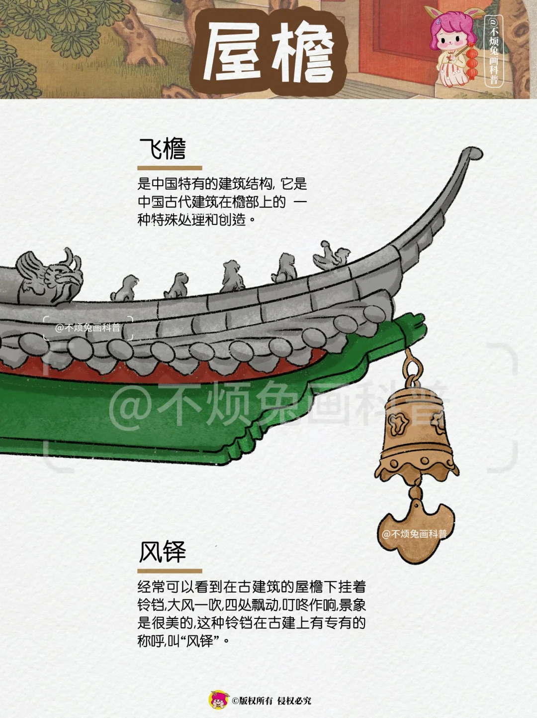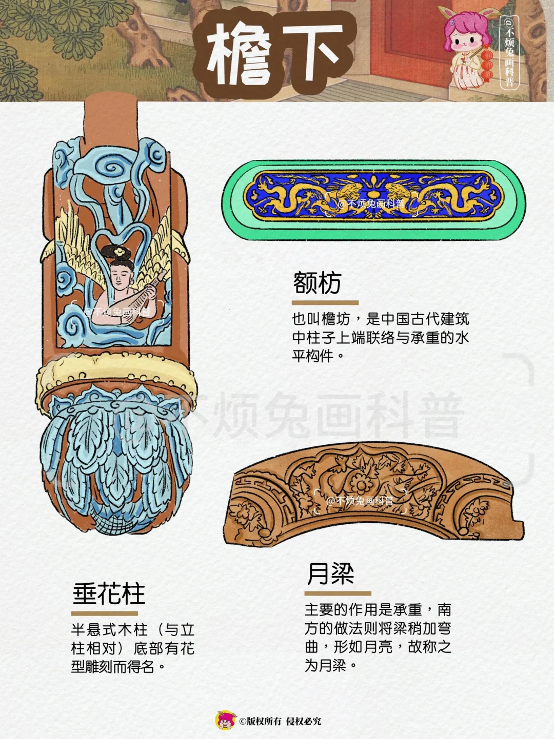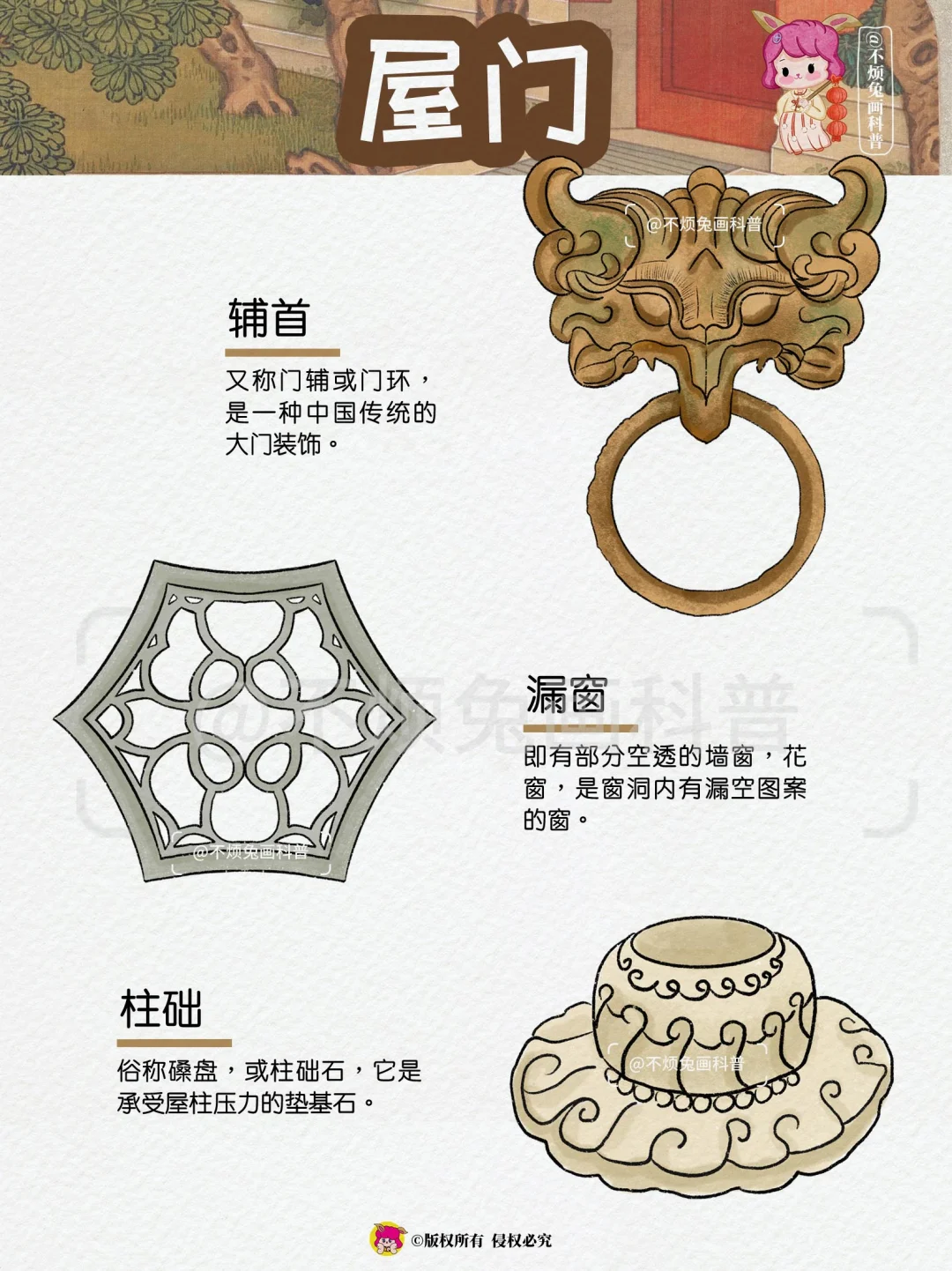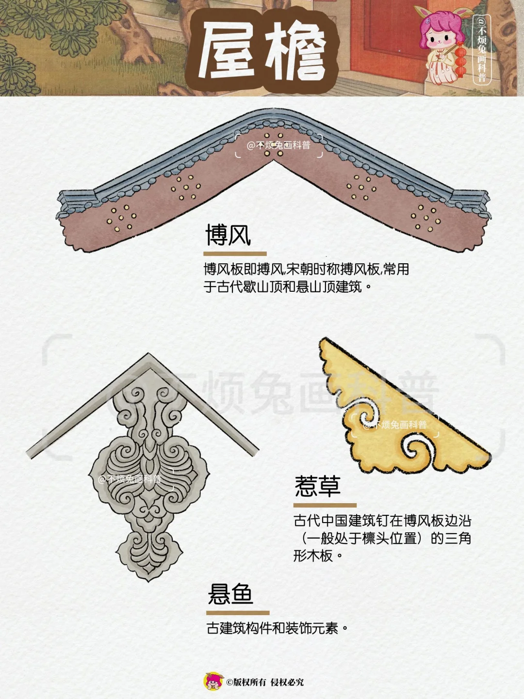 🏡再也不怕弄混古建筑的构件了,跟着不烦兔一起来看古建筑吧! - 1️⃣屋顶 🔻脊兽 🔻脊刹 🔻鸱吻 🔻瓦当 🔻滴水 2️⃣屋檐 🔸飞檐 🔸风铎 🔸博风 🔸惹草 🔸悬鱼 3️⃣檐下 🔻牛腿 🔻雀替 🔻额枋 🔻垂花柱 🔻月梁 4️⃣屋门 🔸户对 🔸门当 🔸影壁 🔸辅首 🔸漏窗 🔸柱础 -