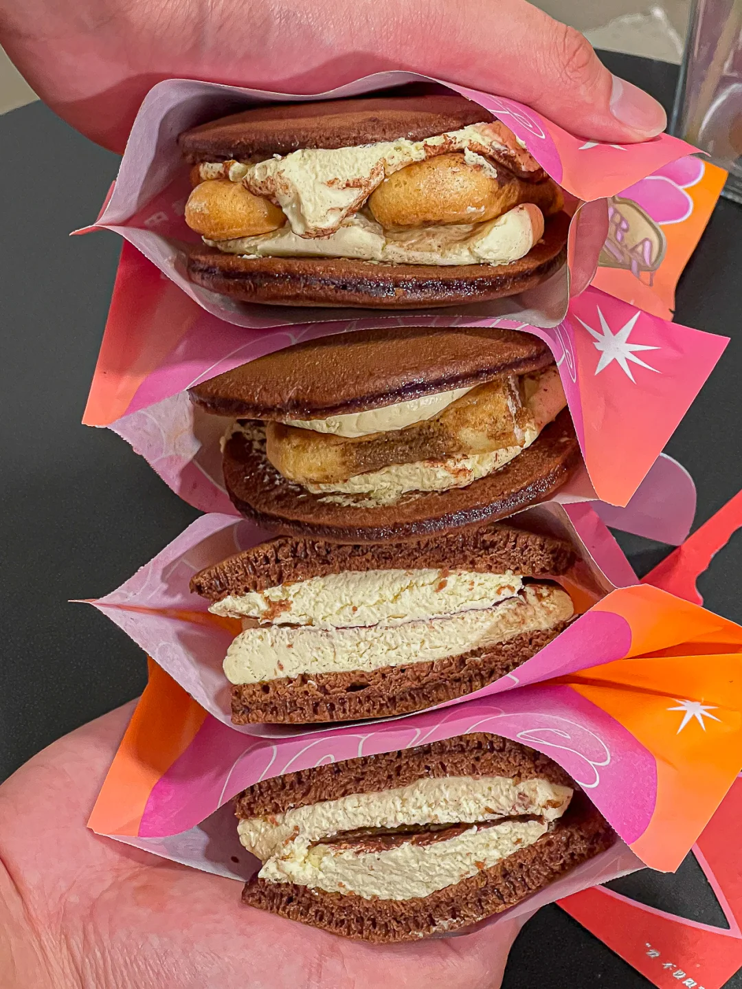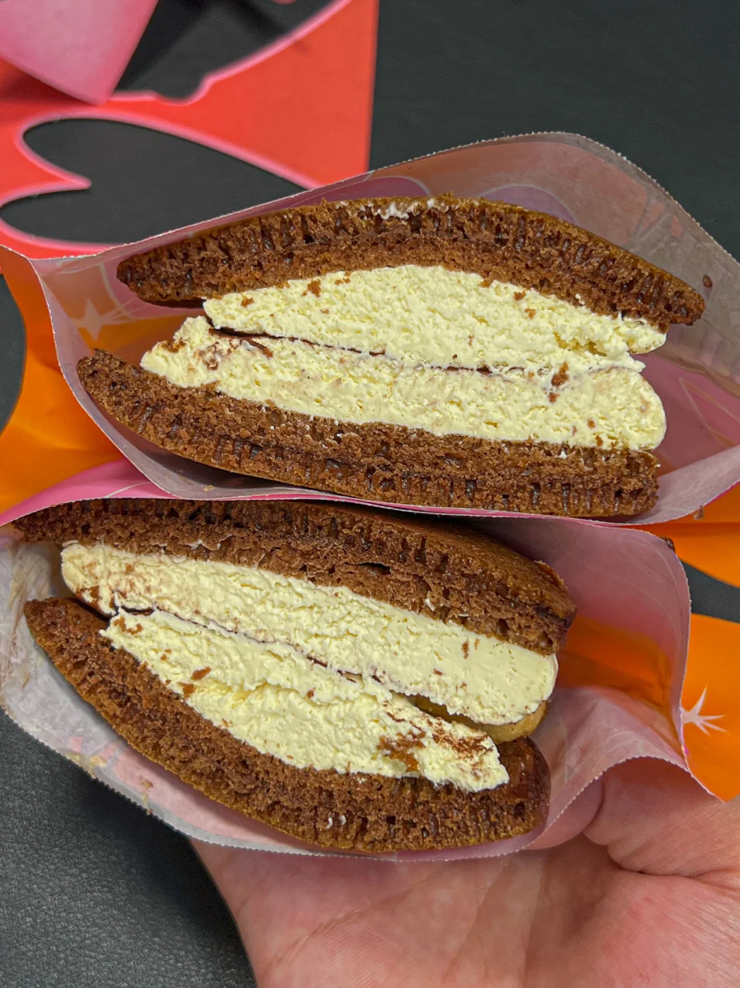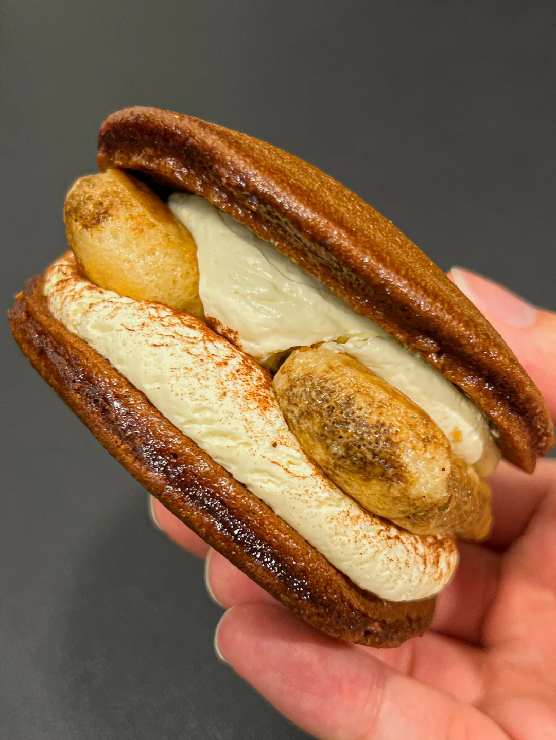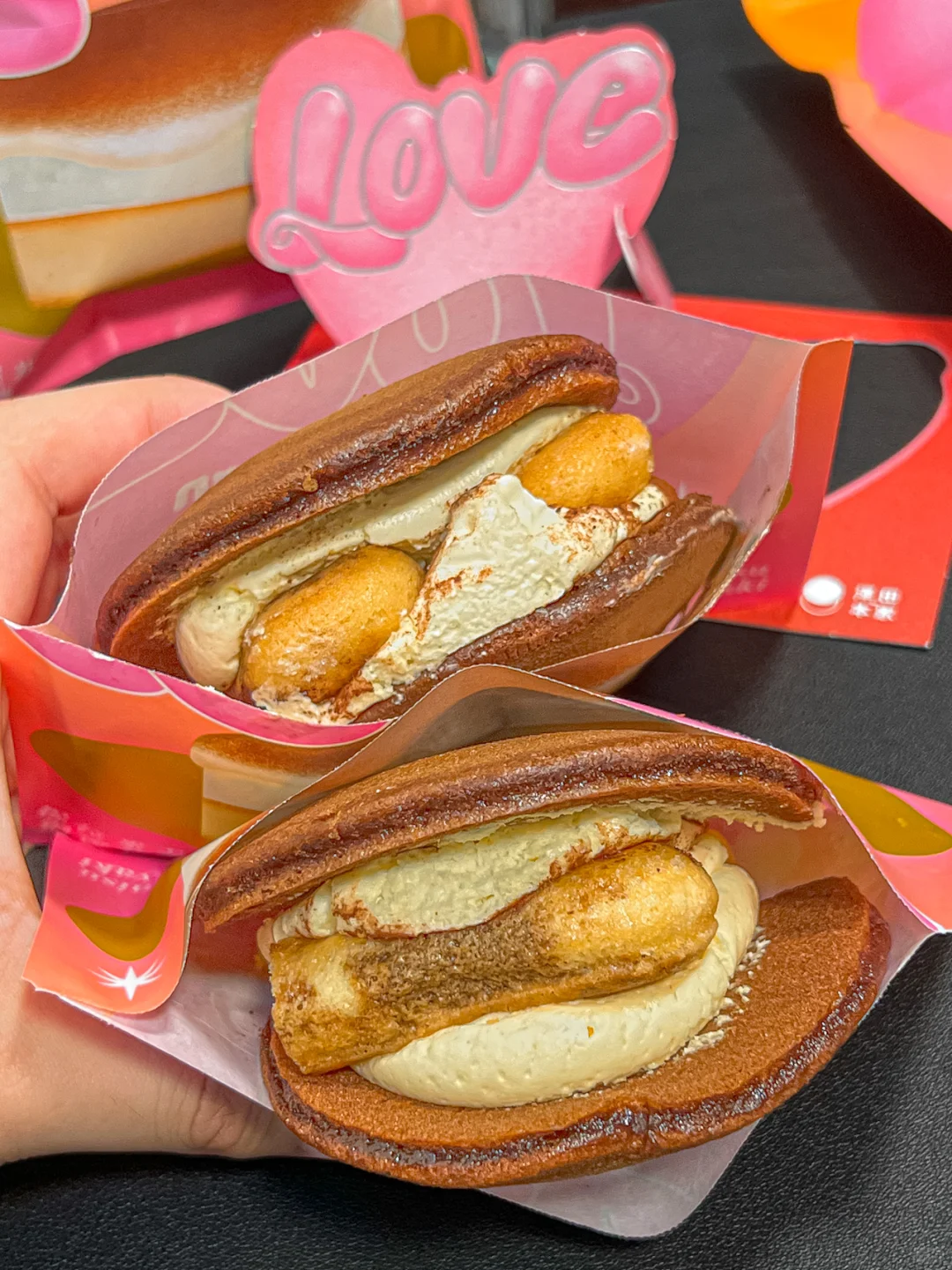 在广州也可以吃到了。。。 想不到提拉米苏也可以被放进铜锣烧里 放在铜锣烧界都很炸裂…提拉米苏铜锣烧 有沾着咖啡液的手指饼干和马斯卡彭奶油,表面还撒着可可粉你别说还很像提拉米苏啊 口感扎实,奶油也不会甜腻好好吃!!在体育西可以去吃~ -