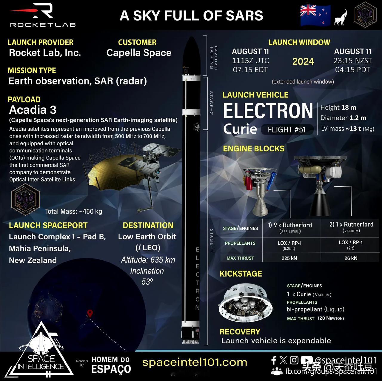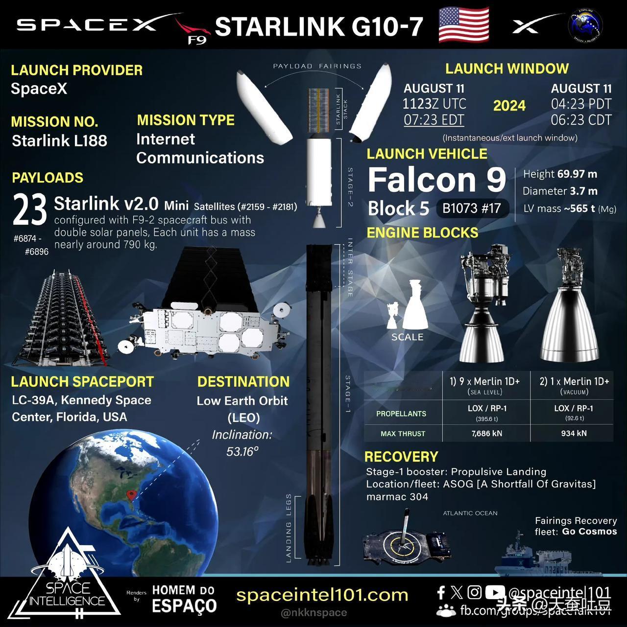 🇺🇸美帝今日两连射: 19:23 BJT,电子号,Acadia 3,LC-1B 21:41 BJT,猎鹰9号,星链G10-7,LC-39A 。 【同一分钟内 电子号猎鹰九号相继升空】随着火箭实验室官方敲定今晚电子号点火时间为19:23,巧合的一幕也随之上演: 同样是8月11日19:23,一枚猎鹰九号火箭将在肯尼迪航天中心升空,执行星链G10-7任务,将23颗有效载荷送往近地轨道。编号为B1073.17的芯级将降落至“不够庄重”回收船完成海上回收。#鹰旗一号# #核心一号#