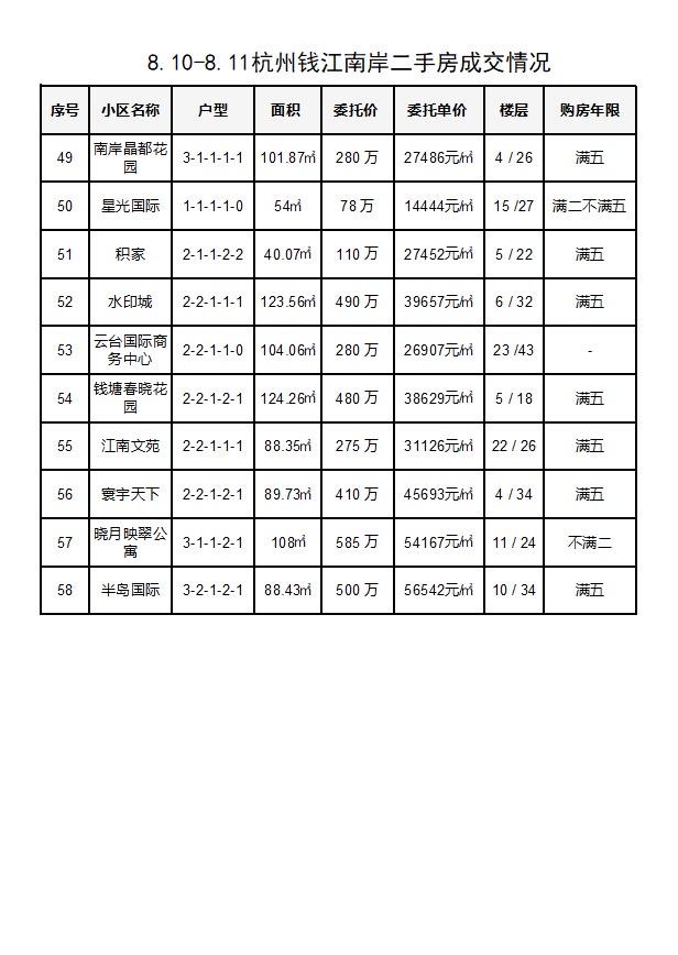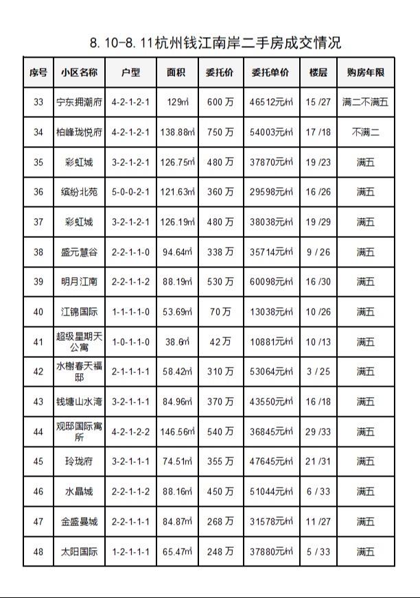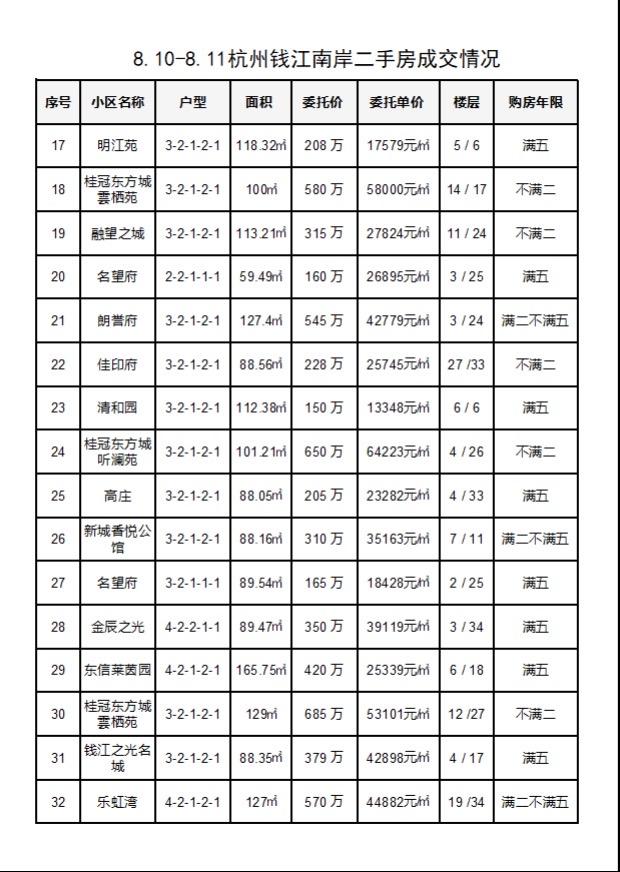 8.10-8.11杭州钱江南岸(滨江和萧山)二手房每日成交数据分享,近两日共成交