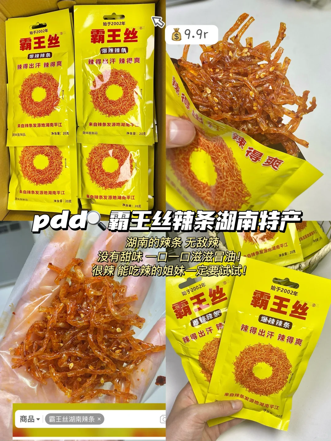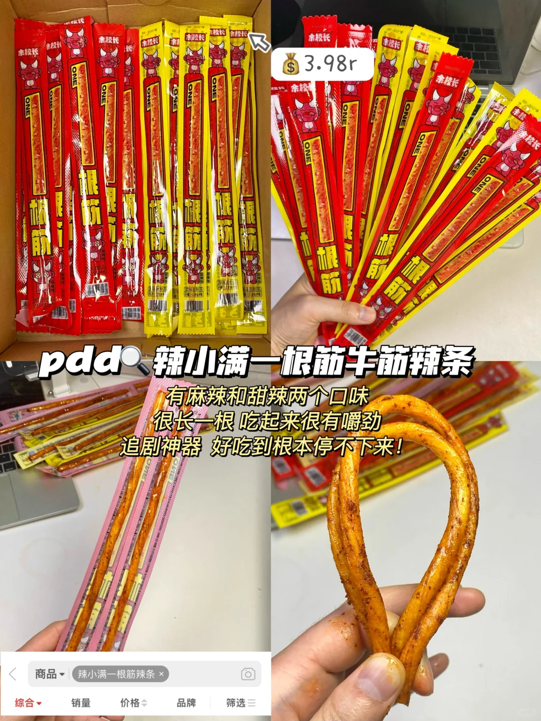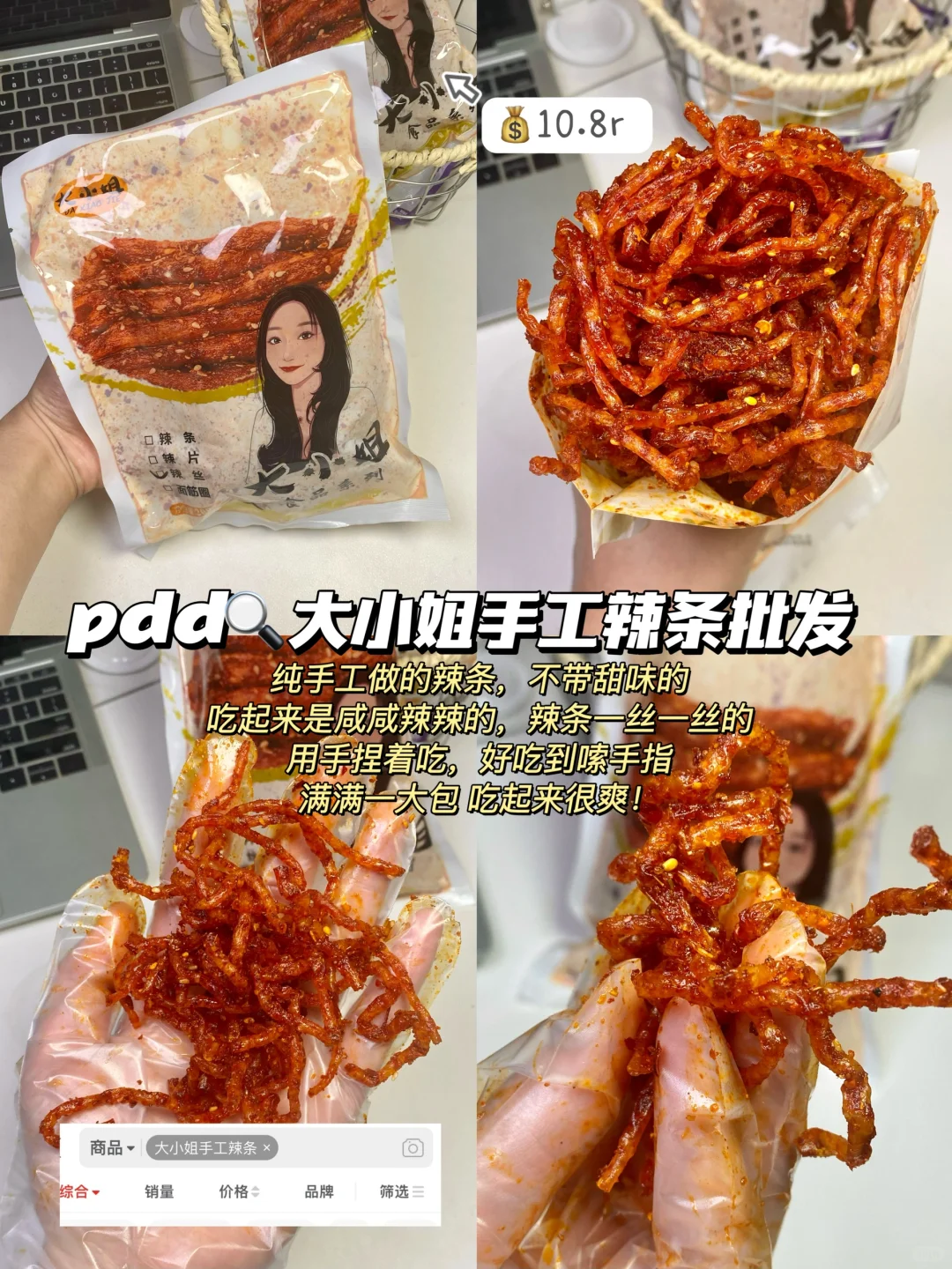 纯分享,理性种草!! 都是自己回购过好多次的辣条,好吃不贵! 1⃣️霸王丝 湖南的辣条 无敌辣 没有甜味 一口一口滋滋冒油! 很辣 能吃辣的姐妹一定要试试! 2⃣️辣白菜辣条 甜辣口辣条,越嚼越香! 是辣白菜那个味道,好吃到停不下来! 硬硬脆脆的口感,安利给喜欢吃 甜辣辣条的姐妹! 3⃣️双凤辣条 贵州特产辣条 它的辣子超级无敌香 香香辣辣的,是咸辣口的 吃起来很有嚼劲!这次买的小包装的 再也不用担心吃不完了 4⃣️一根筋辣条 有麻辣和甜辣两个口味 很长一根 吃起来很有嚼劲 追剧神器 好吃到根本停不下来! 5⃣️大小姐手工辣条爆辣辣丝 纯手工做的辣条,不带甜味的 吃起来是咸咸辣辣的,辣条一丝一丝的 用手捏着吃,好吃到嗦手指 满满一大包 吃起来很爽! 6⃣️周在德香油条 喜欢咸口辣条的,肯定会爱香油条! 香辣香辣的,偏辣!重口味必入!口感软软的,很有筋道!现在出的小包装更方便了 ✔️小的tips,大家平时实在不知道怎么挖好吃的,可以试试我的方法 pdd 搜 开袋即食小吃 就会出来很多宝藏啦,分享给姐妹,等大家反馈安利咯!