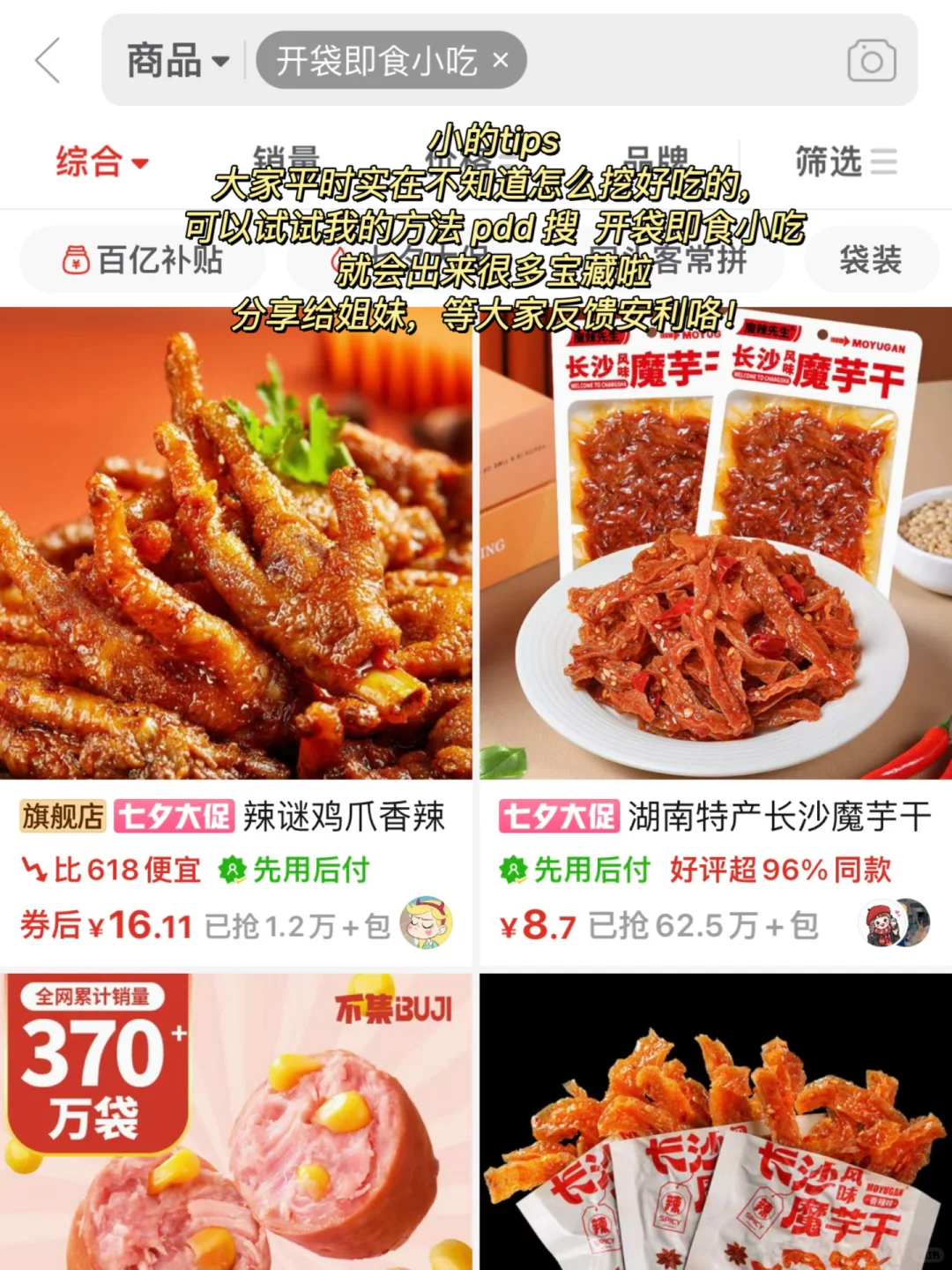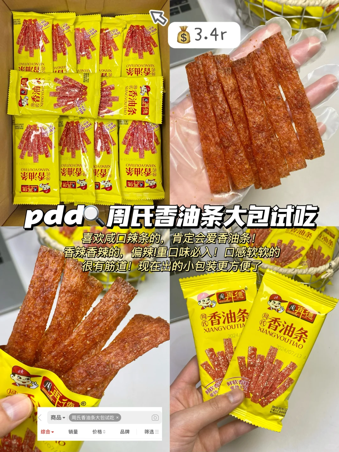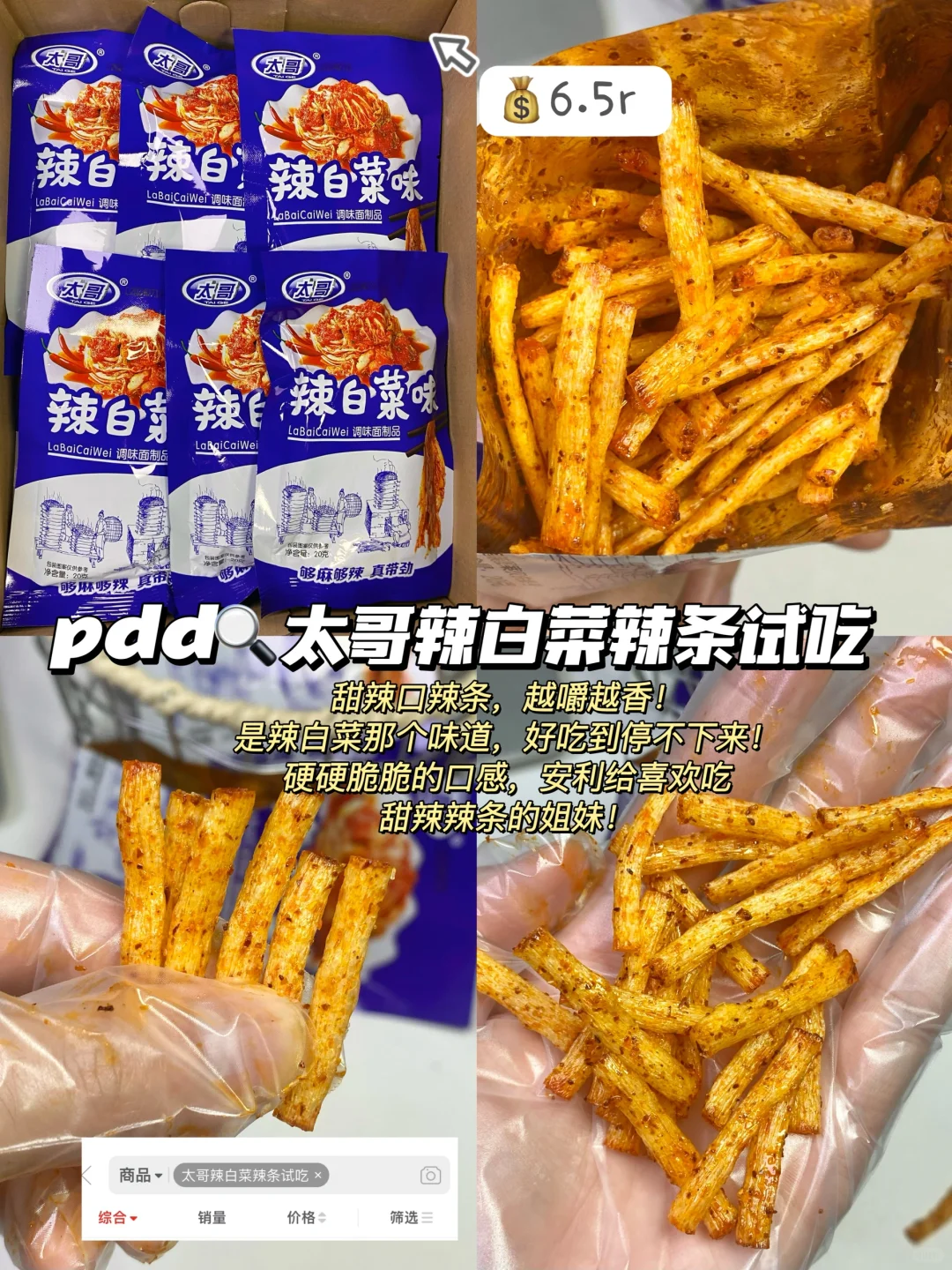 纯分享,理性种草!! 都是自己回购过好多次的辣条,好吃不贵! 1⃣️霸王丝 湖南的辣条 无敌辣 没有甜味 一口一口滋滋冒油! 很辣 能吃辣的姐妹一定要试试! 2⃣️辣白菜辣条 甜辣口辣条,越嚼越香! 是辣白菜那个味道,好吃到停不下来! 硬硬脆脆的口感,安利给喜欢吃 甜辣辣条的姐妹! 3⃣️双凤辣条 贵州特产辣条 它的辣子超级无敌香 香香辣辣的,是咸辣口的 吃起来很有嚼劲!这次买的小包装的 再也不用担心吃不完了 4⃣️一根筋辣条 有麻辣和甜辣两个口味 很长一根 吃起来很有嚼劲 追剧神器 好吃到根本停不下来! 5⃣️大小姐手工辣条爆辣辣丝 纯手工做的辣条,不带甜味的 吃起来是咸咸辣辣的,辣条一丝一丝的 用手捏着吃,好吃到嗦手指 满满一大包 吃起来很爽! 6⃣️周在德香油条 喜欢咸口辣条的,肯定会爱香油条! 香辣香辣的,偏辣!重口味必入!口感软软的,很有筋道!现在出的小包装更方便了 ✔️小的tips,大家平时实在不知道怎么挖好吃的,可以试试我的方法 pdd 搜 开袋即食小吃 就会出来很多宝藏啦,分享给姐妹,等大家反馈安利咯!