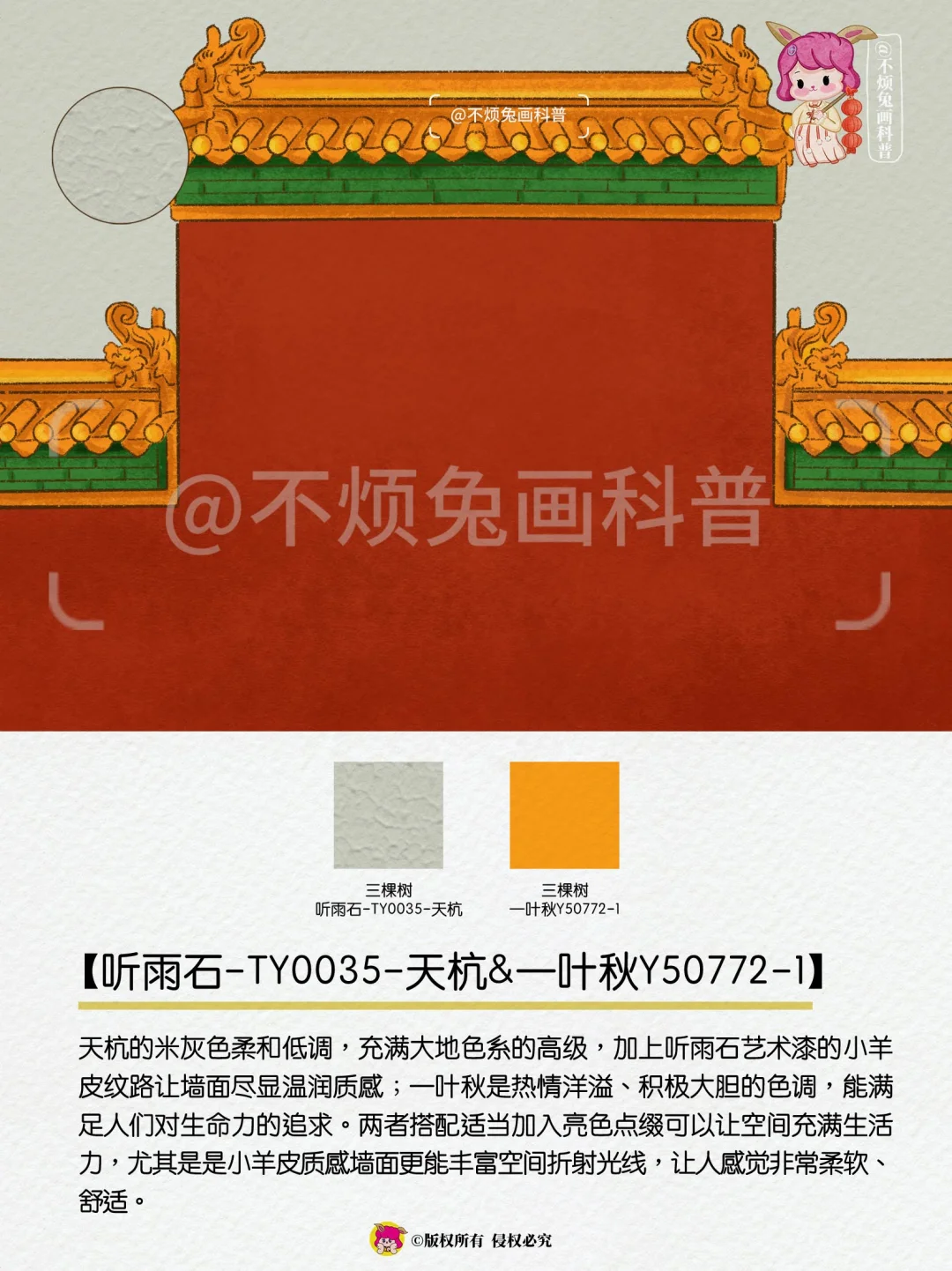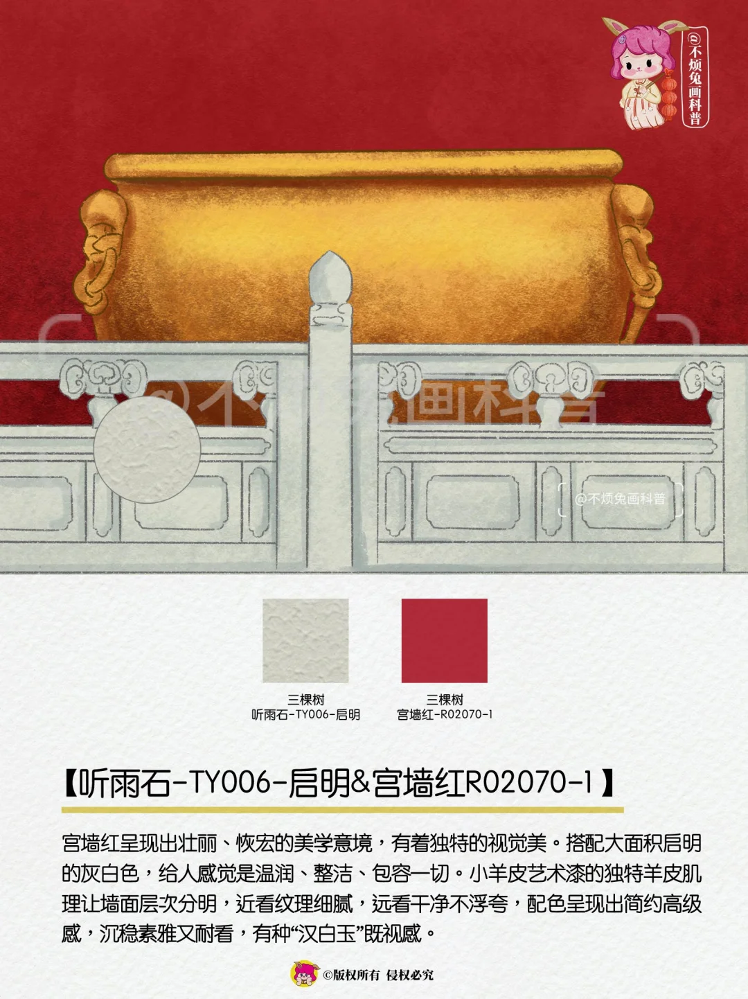 🔸有一种说法,中国美的颜色都在故宫里,白浅、翠微、水天、落霞、宫阙、繁花,共同构成了一组故宫色卡。故宫的配色之所以高级,因为它遵循了古代建筑色彩的等级制度:即红、黄的鲜艳色,再运用巧妙地色彩搭配,铸造成属于东方的经典美学。时空流转,三棵树听雨石则把细腻的小羊皮纹理和网红色体系融合,巧妙的把老祖宗的配色传承到家家户户中,用经典色彩品质打造古文化与现代的碰撞。