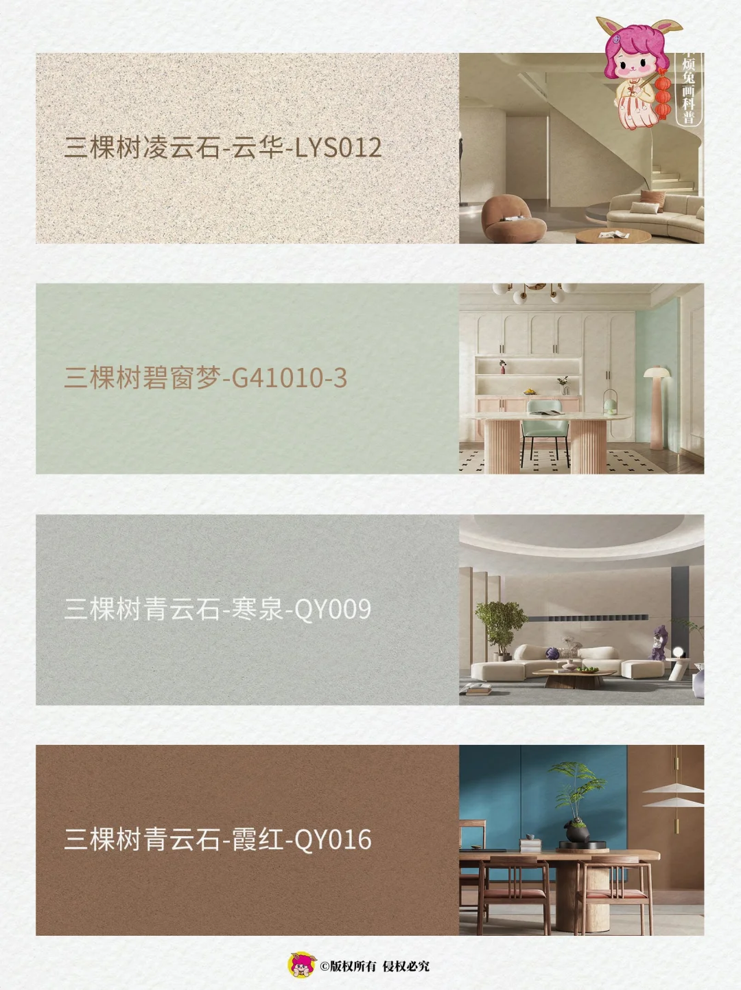 天杭的米灰色柔和低调,充满大地色系的高级,加上听雨石艺术漆的小羊皮纹路让墙面尽显温润质感;一叶秋是热情洋溢、积极大胆的色调,能满足人们对生命力的追求。两者搭配适当加入亮色点缀可以让空间充满生活力,尤其是是小羊皮质感墙面更能丰富空间折射光线,让人感觉非常柔软、舒适。