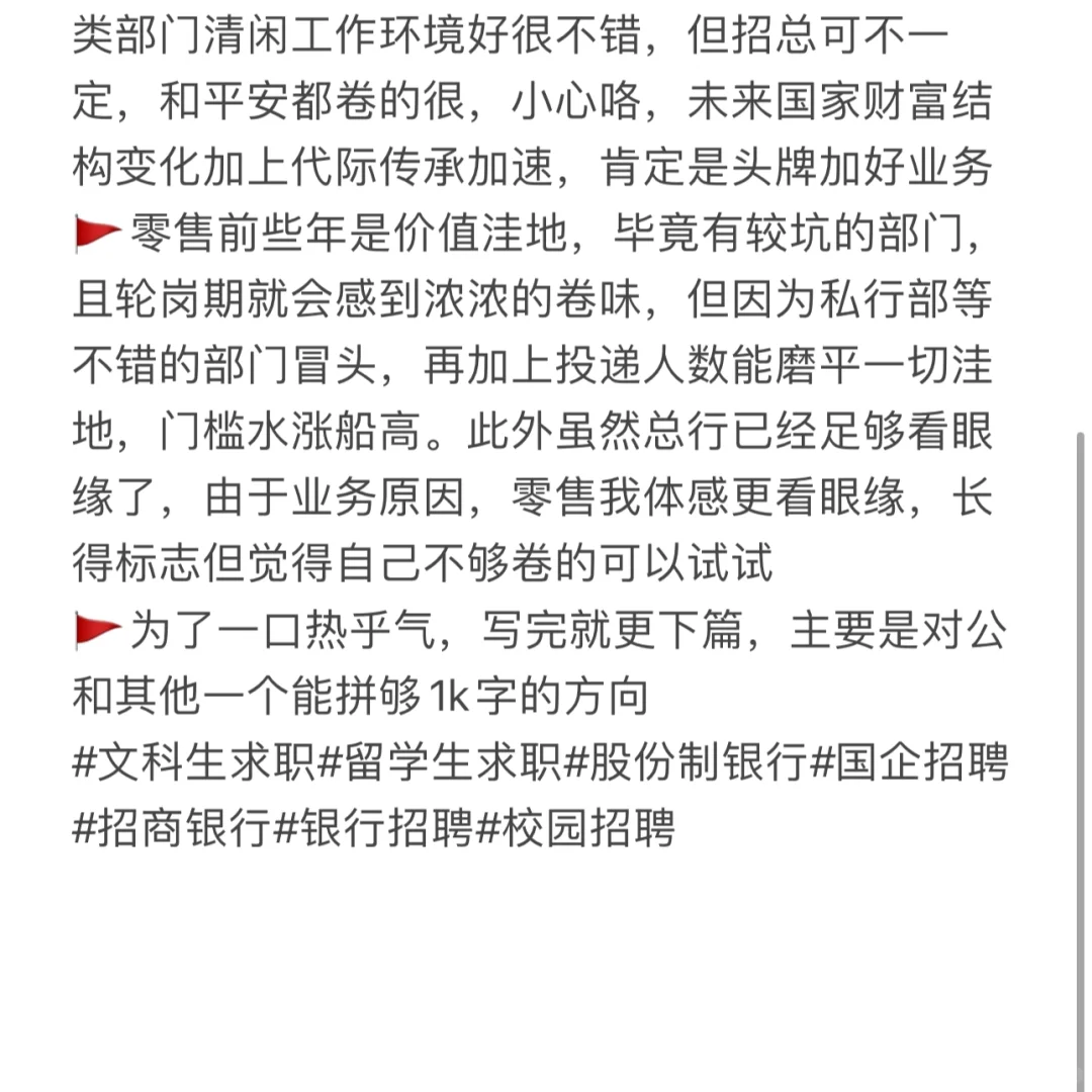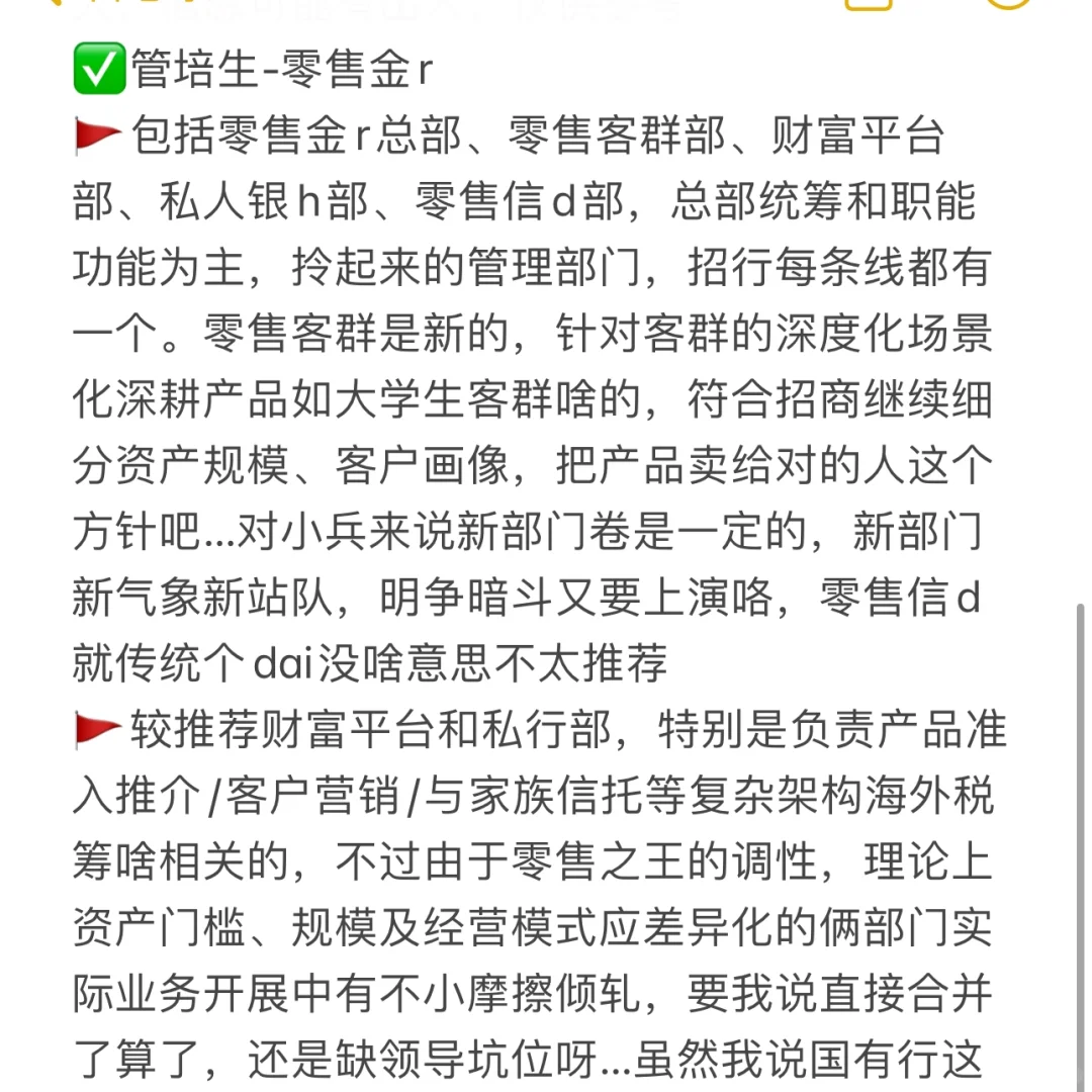 🚩较推荐财富平台和私行部,特别是负责产品准入推介/客户营销/与家族信托等复杂架构海外税筹啥相关的,不过由于零售之王的调性,理论上资产门槛、规模及经营模式应差异化的俩部门实际业务开展中有不小摩擦倾轧,要我说直接合并了算了,还是缺领导坑位呀…虽然我说国有行这类部门清闲工作环境好很不错,但招总可不一定,和平安都卷的很,小心咯,未来国家财富结构变化加上代际传承加速,肯定是头牌加好业务