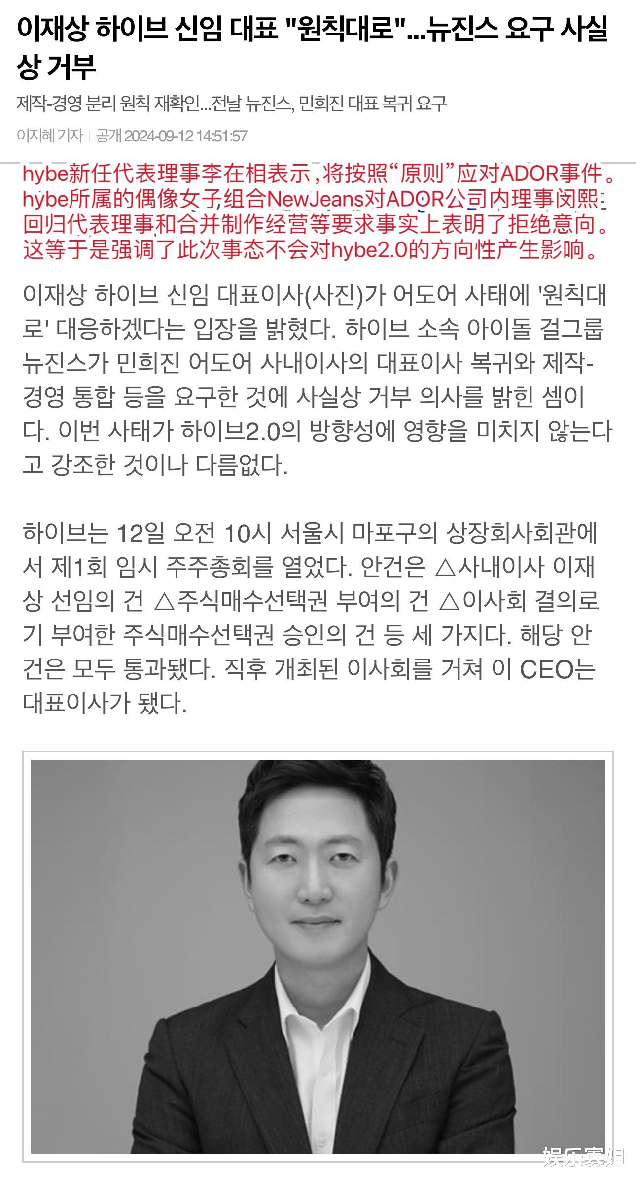 嗨!这里是娱乐寡姐,为你带来最新娱乐资讯。New Jeans硬刚失败!据韩媒报道,HYBE新任代表理事李在相表示,将按照原则应对ADOR事件,拒绝了New Jeans要求。引发海内外Kpop粉丝热议。怎么说呢,完全就是意料之中,哪个大公司能允许旗下打工人抬杠还威胁的。