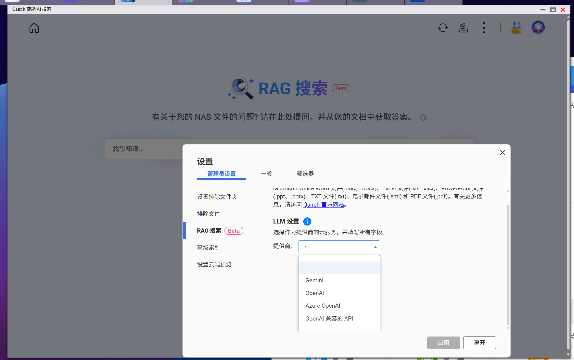▼另外Qsirch以支持RAG Beta,想要借助大语言模型构建知识库的小伙伴们可以进行尝试了。目前提供的有Gemini、OpenAI、Azure Open AI等LLM。