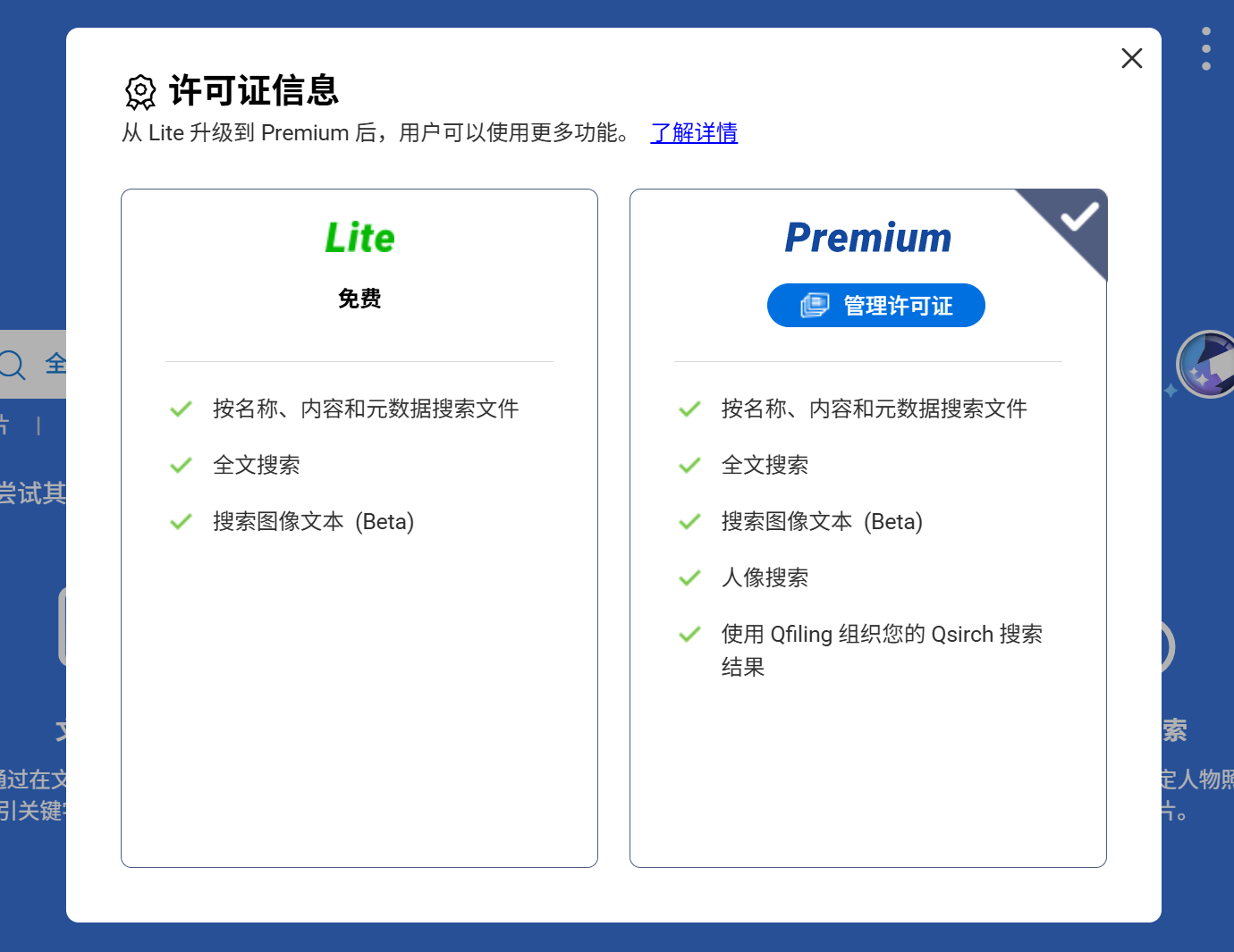 ▼之前Qsirch为用户提供Lite免费版本,Premium许可可以进行人像搜索、并且使用Qfiling组织搜索结果,从QTS5.3.3版本以后,Premium许可全面开放,如果你没有升级到这个版本,可以“0元“购买授权先。